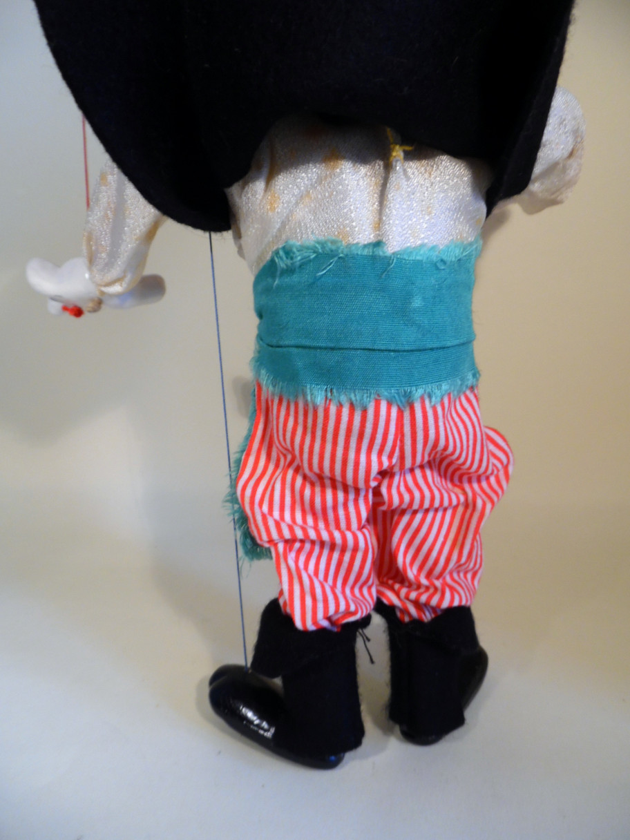 Type SL pirate Mouse rare 1963 type puppet. The Pirate Mouse is very good with some minor flaws. The head and face are very good with good pirate hat with skull and crossbones felt patch. The shirt is mottled with ageing stains front and back. There is also a small hole in one sleeve. The sash is good and the striped trousers are clean and bright. Good thick felt uppers for the boots and black shoes. The waistcoat is made from very thick felt and is missing the 1963 label, I assume this is home made and the original one with label was removed. Box is very good with owners name written on the top. Stamped Pirate Mouse one end. Priced taking into account the lack of label and waistcoat. A very good chance to own a very rare 1963 range puppet which does not often appear for sale. ( I am also adding a 1963 Crow to the shop tonight and the Crow has two labels, so if you really wanted to buy both, you could maybe use one of the labels for the Pirate Mouse )