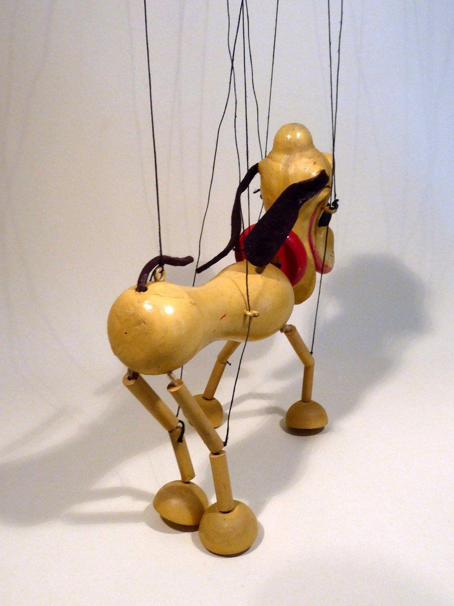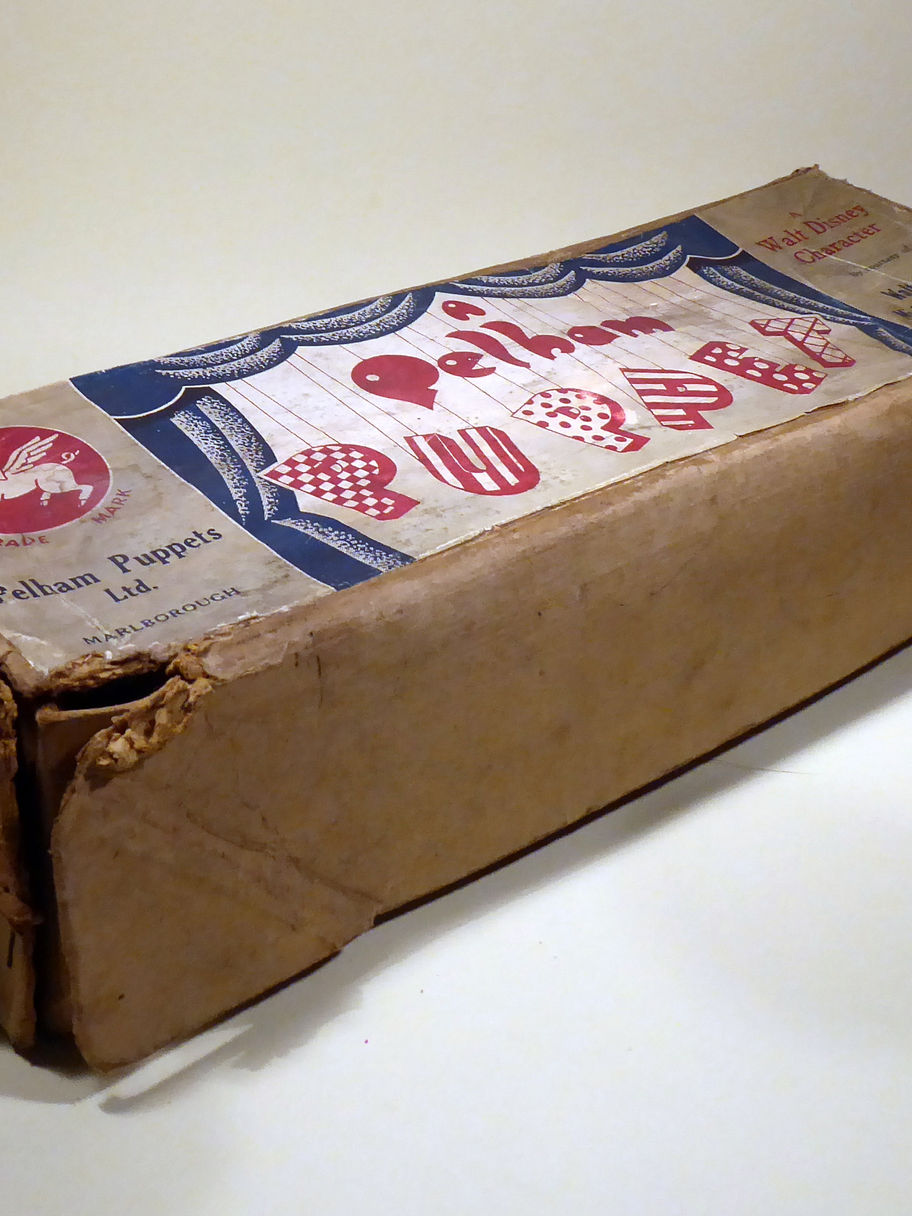 Type SL Pluto the Walt Disney character, 1950's era. He is in very good condition. He has the wooden red collar. Both ears and felt tail are good. The head is attached to a ring with an elastic band which is a replacement, this enables him to bob his head. This one has a original big felt tongue. Box is stamped correctly and is poor used condition. Pelpop letter included.