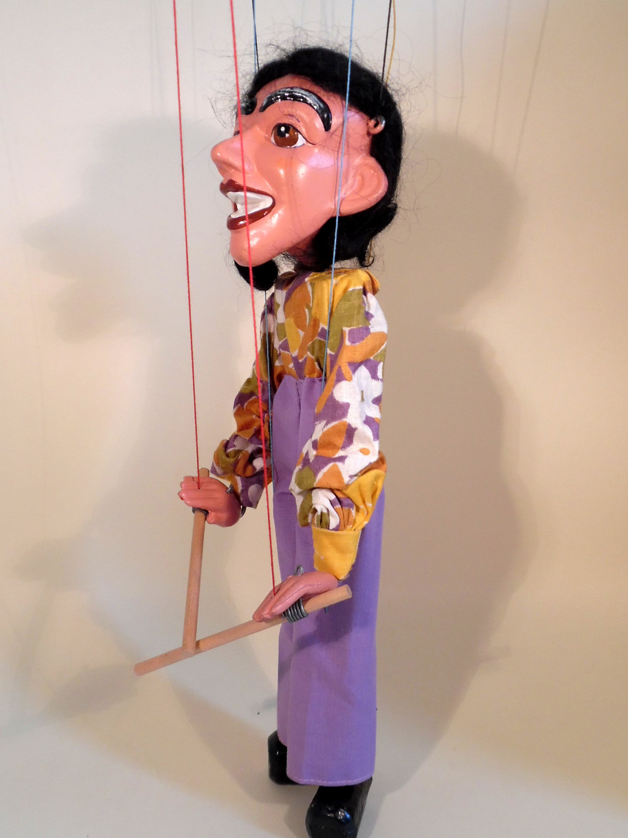 Type SL Pop Singer, Drummer. Puppet is in very good condition, good clean clothes with no defects. He carries both drumsticks. Box is shelf worn and has no end stamp, only the signs of a sticker removed.