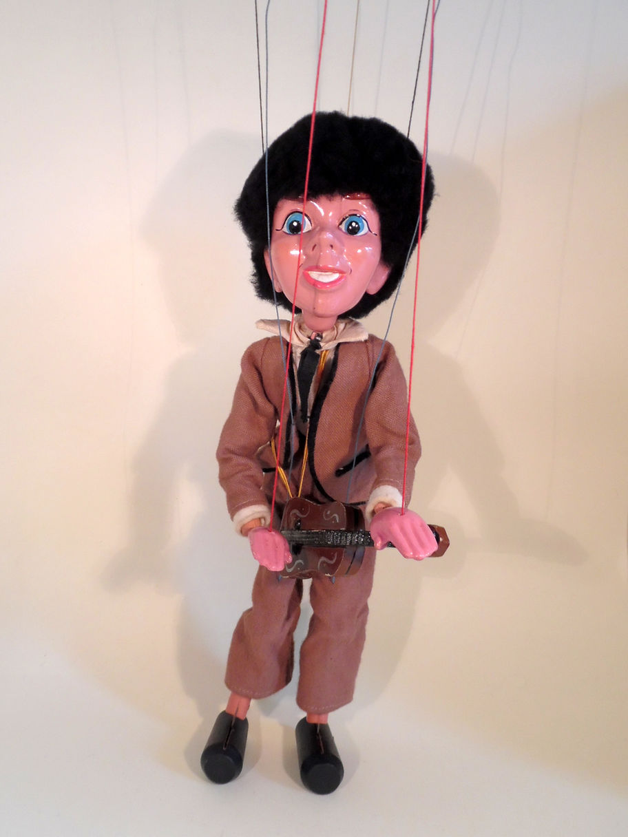 Type SL Pop Singer the guitarist. This version of Pop Singer has the brown suit which is fairly rare to find, making the whole set of the band a little more tricky to collect. He has wooden legs and composition hands. Both guitarists in brown suits are available, they each have a different head shape. The Saxophone Player and drummer will be available next week. He is in good condition with slightly yellowed collar and cuffs and crumpled clothes from storage, the hand strings are quite long and could be shortened. (Hand string lifted up for images) The box has a split and hand written name one end as seen.