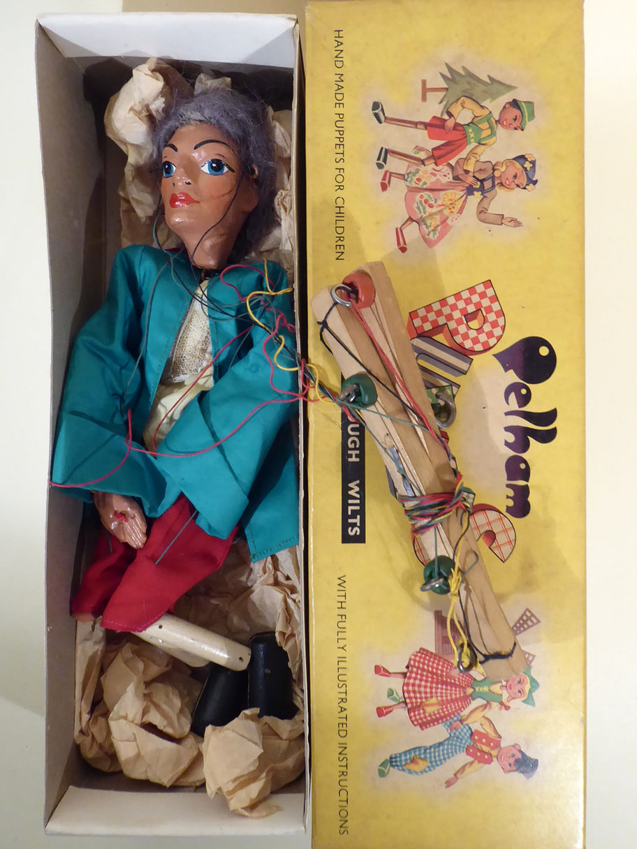 Type SL Prince charming 1950's. He is in very good condition. The clothes are good, clean and bright. He has good face paint. The hairline is slightly taken back and there is some hardened glue on the hair. (see images) He retains a small red ribbon tying his grey hair. He has the smaller type of composition hands. Strung on coloured threads and the first type of control to add buffers. The box is unstamped and in good used condition.