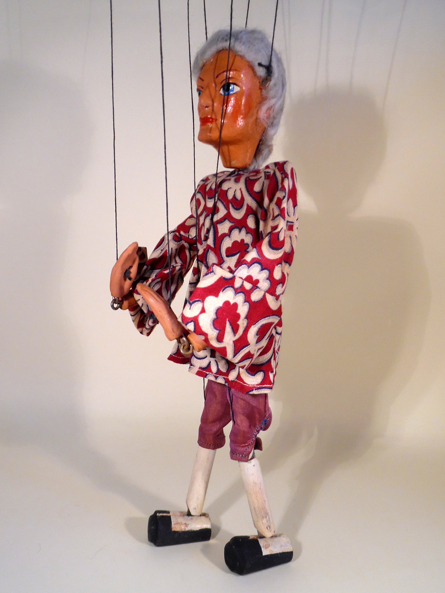 Type SL Prince Charming 1950's. He has very good clothes and the first version white and black painted shoes. The hair is a little thin and there's not much of it. Blue label box has Prince Charming handwritten on one end. Instructions included.