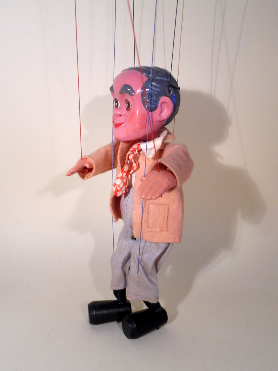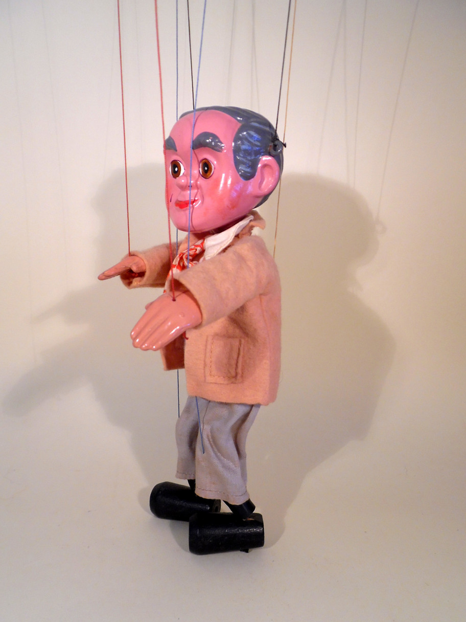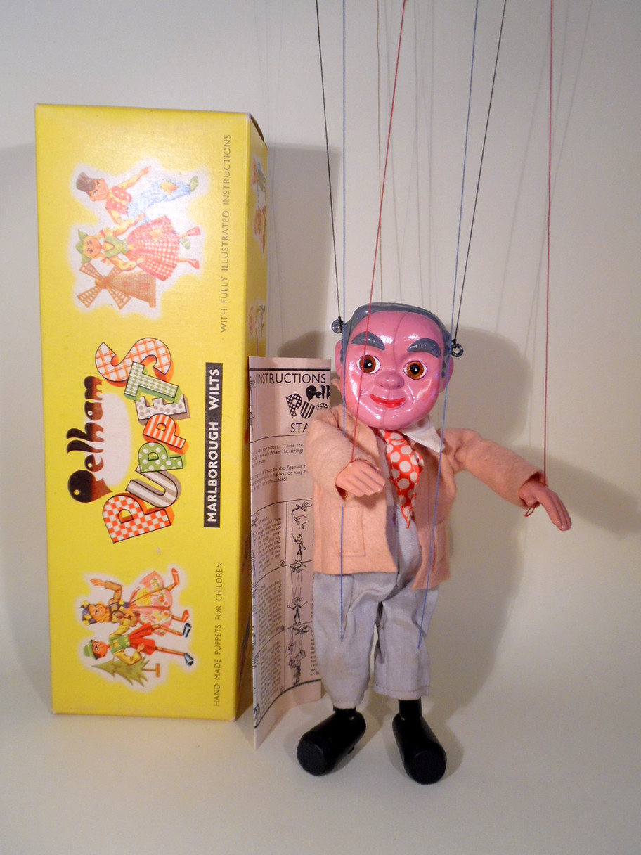 Type SL Professor Popkiss a TV character from 'Supercar' by Gerry Anderson 1959. He is in good used condition with good thick felt jacket and shirt complete with tie. The whole costume is just a little aged. The trousers have some age mottling. The screw eyes are rusted. He has the darker skin tone for hands and face. The box is stamped but too faintly to read, I could read it but now I can't! The end sticker is still intact. It is in excellent condition with a set of instructions included.