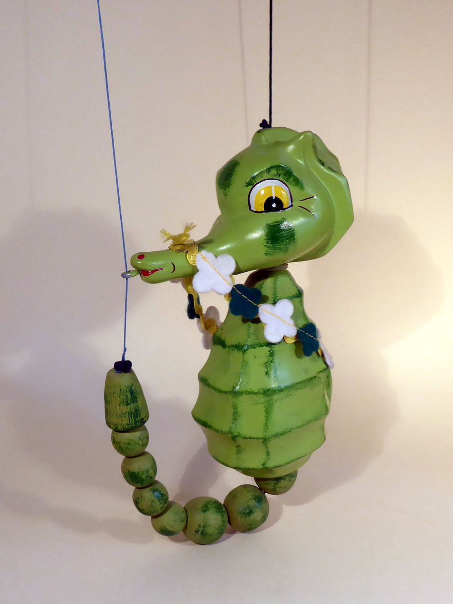 Type SL Seahorse, probably one of the rarest puppets to find. This puppet was one of the 1963 range of puppets, then, with a foam tail which always disintegrated with age. This one has a beaded tail and dates to 1970's maybe. It is in perfect condition with felt flowers still intact. Strung on a single dowel control with two strings. Box is very good untamped and with no evidence of any sticker. The cellophane is missing.