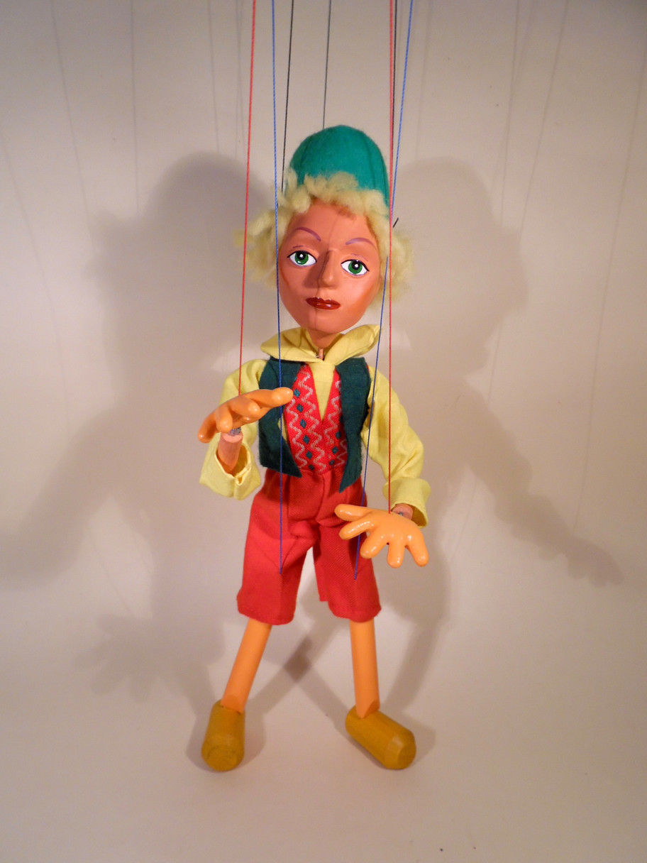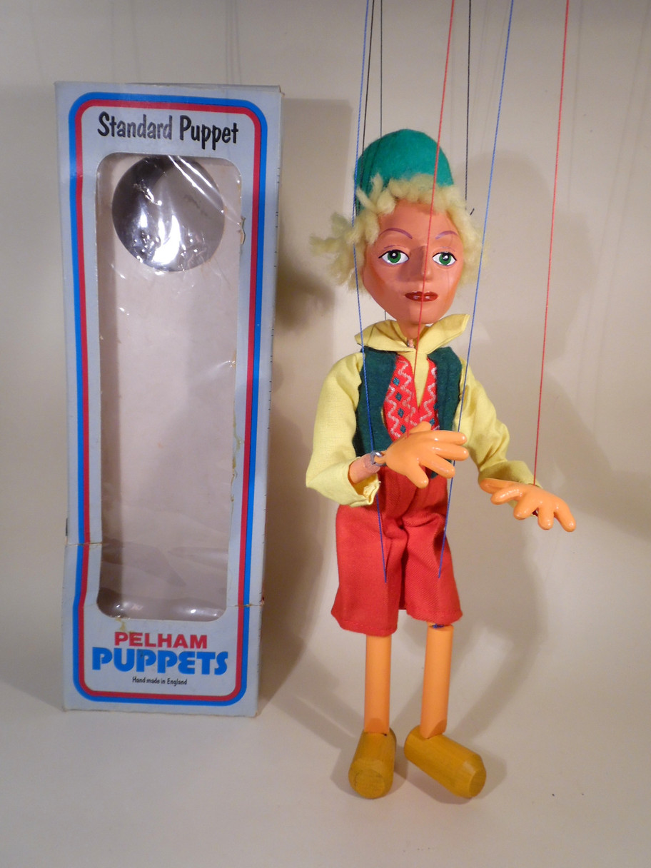 Type SL Swedish Boy 1980's character from the latter days of the factory. Excellent unused condition with original box which is shelf worn. This character has a long T bar control with coloured buffers which is different to the usual type of control used and is original on these later puppets. Some of this character can be seen on a cross bar and some on the long T bar as this one is. Swedish Girl is also being sold separately. Both characters are rare.