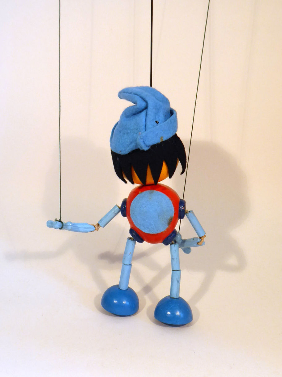 Type SL trug one of the Blue Peter children's TV characters 1970's. Trug has lost a finger but other than that is good with minor signs of ageing. The felt hat doesn't have a hole in the back, it is the metal pin that shows. He is strung on a single bar with three strings. The box is not original to him but is the correct type.