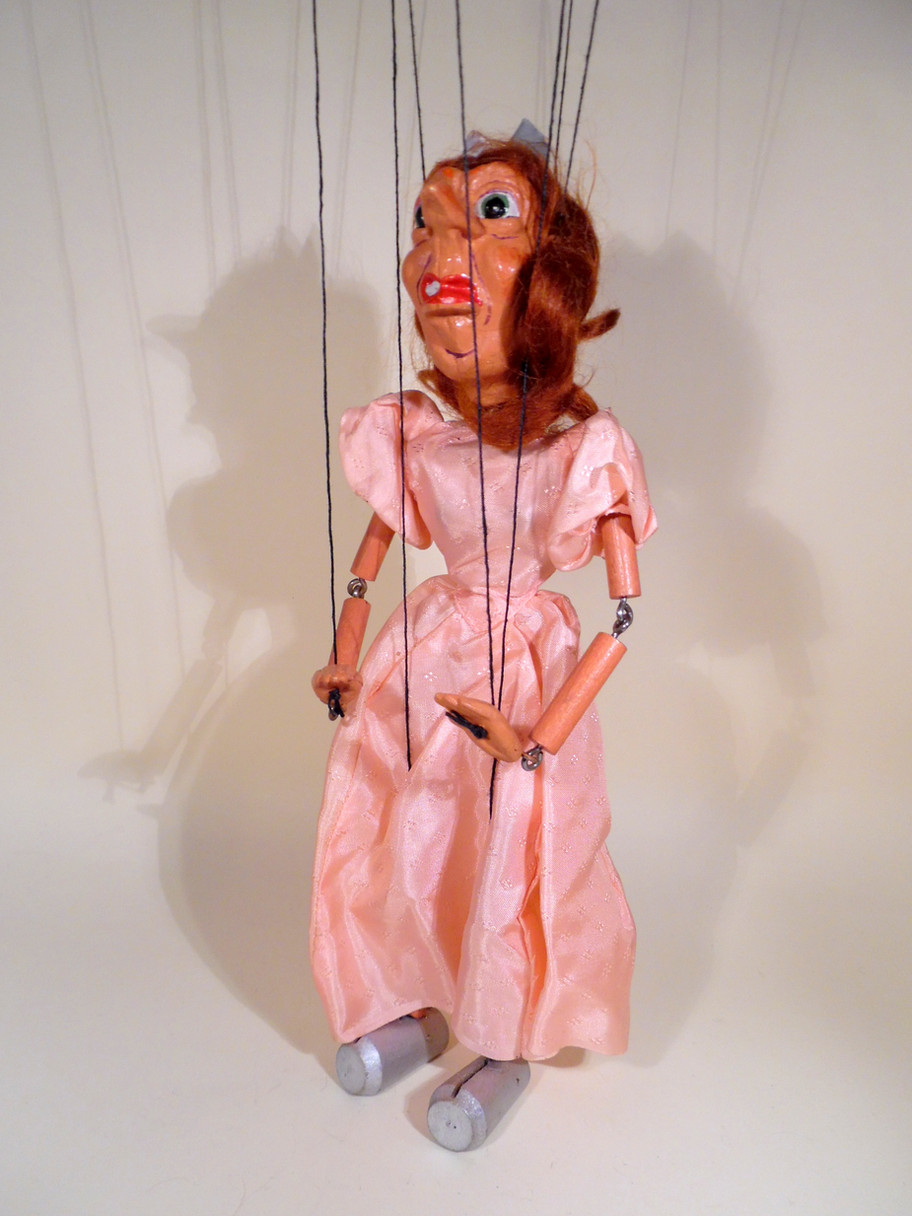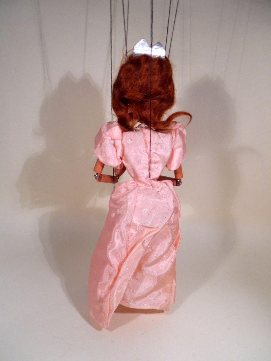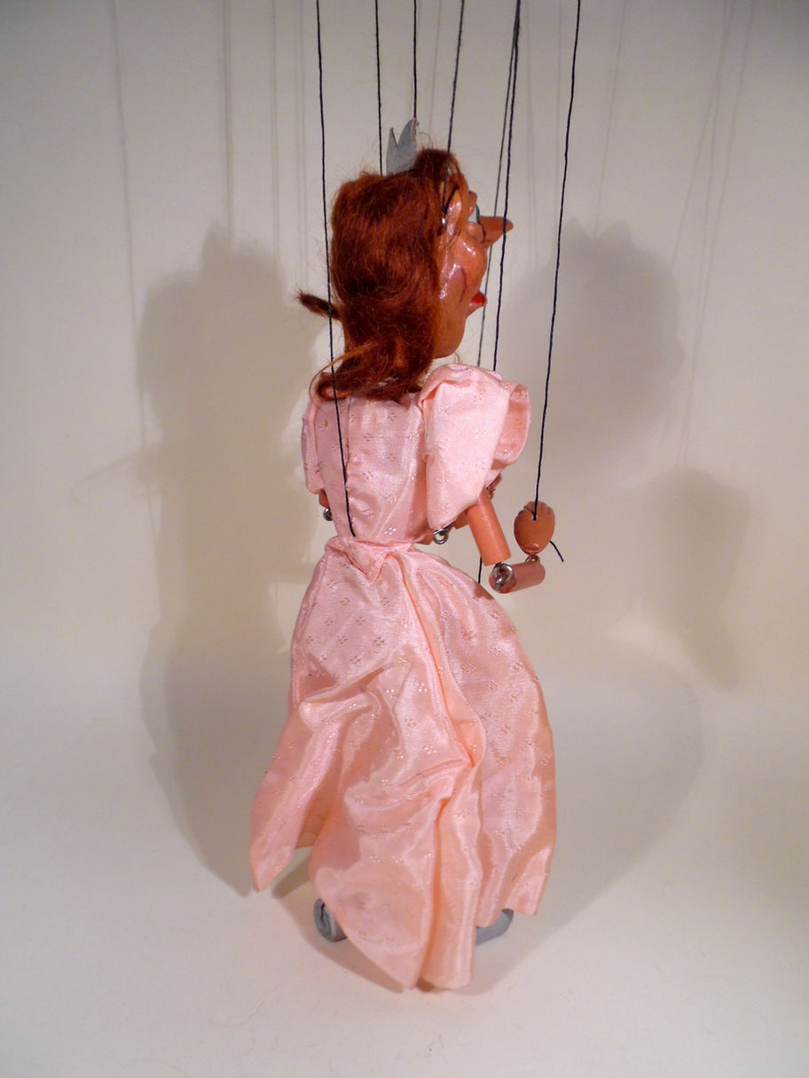 Type SL Ugly Sister, this is the rarer of the two Ugly Sisters and is usually found in dark cerise colour. I have seen her wear pink as this one is. The other Sister wears a blue dress. She is in good condition and has come to the shop from the original owner. Her dress has a two very small holes on her gown and two on her shoulder. She is clean and has bright unrusted screw eyes. She wears a card crown stapled to her head, her auburn hair is a little straggly as often happens. He face with amazing exaggerated features is very good with no damage. The box is good stamped one end Ugly Sister Red.