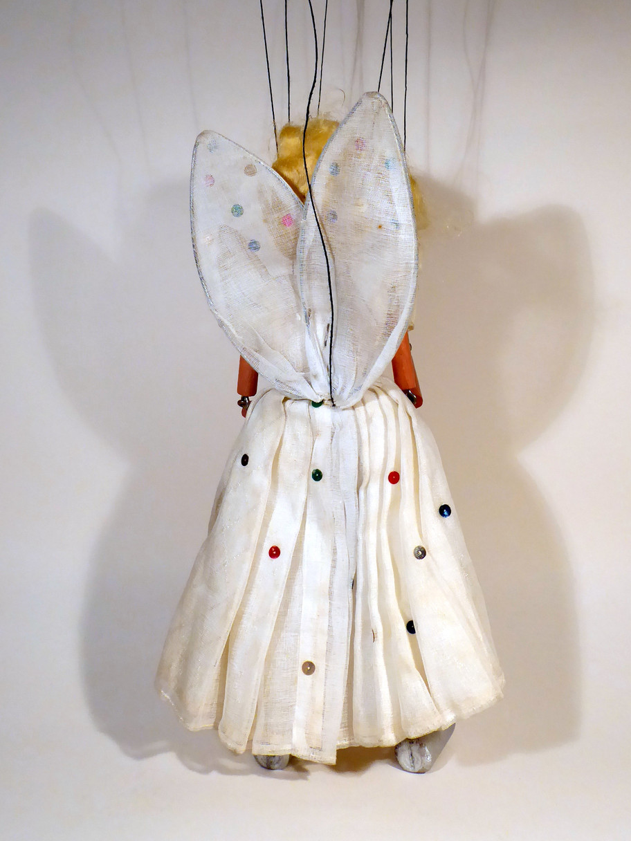 Type SL Wire Winged Fairy, 1950's rarely found puppet, with moulded head and blond hair. The face paint and head is very good. The gown is discoloured and has some ageing with some sequins missing, although most do seem to be present, one wing has a few missing. The wings are sitting well at the back of the gown. The hair is quite straggly and lifted up from the forehead. The puppet wears white shorts under the gown which are good. She has silver shoes. The screw eyes are clean and not rusted on the puppet. The box is stamped SS Girl so is not original and is in good condition.