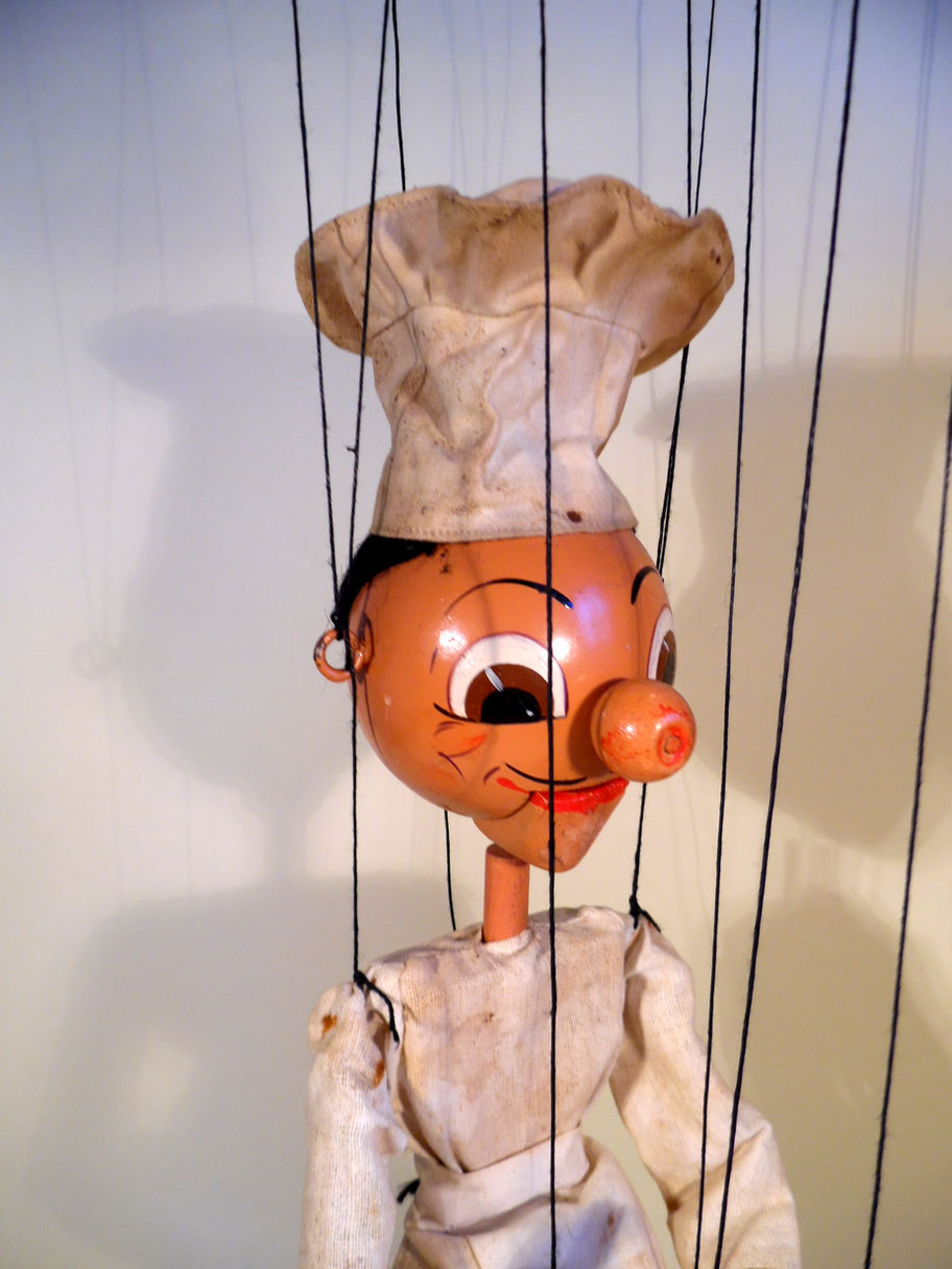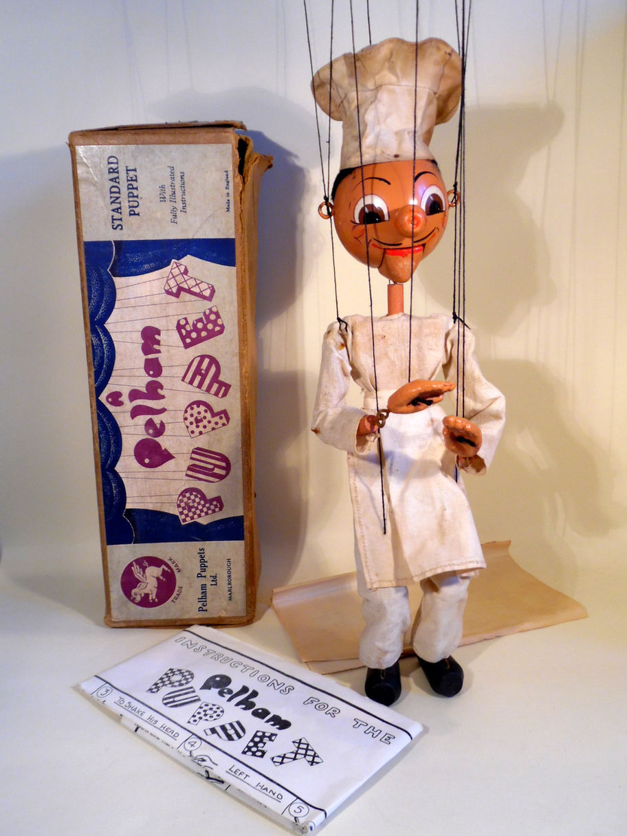 Type SM Chef 1950's rare puppet. This chef has complete clothes with sturdy chefs hat. The clothes have suffered from damp/mould and rust marks. The chefs outfit is often stained and discoloured. The face is good but the small beard is missing. The type of fabric used for his hair and therefore his beard is the black flock from the 1950's. I am selling puppets with this material in the miscellaneous page for spares, so please take a look as a good match could be cut and used. His hair is damaged by moth but could also be replaced. He has been restrung as there are the original holes in the trousers and shoulders. The box is the correct era but stamped SM Witch and is aged. Please see images for the best description. Set of instructions and club letter included.