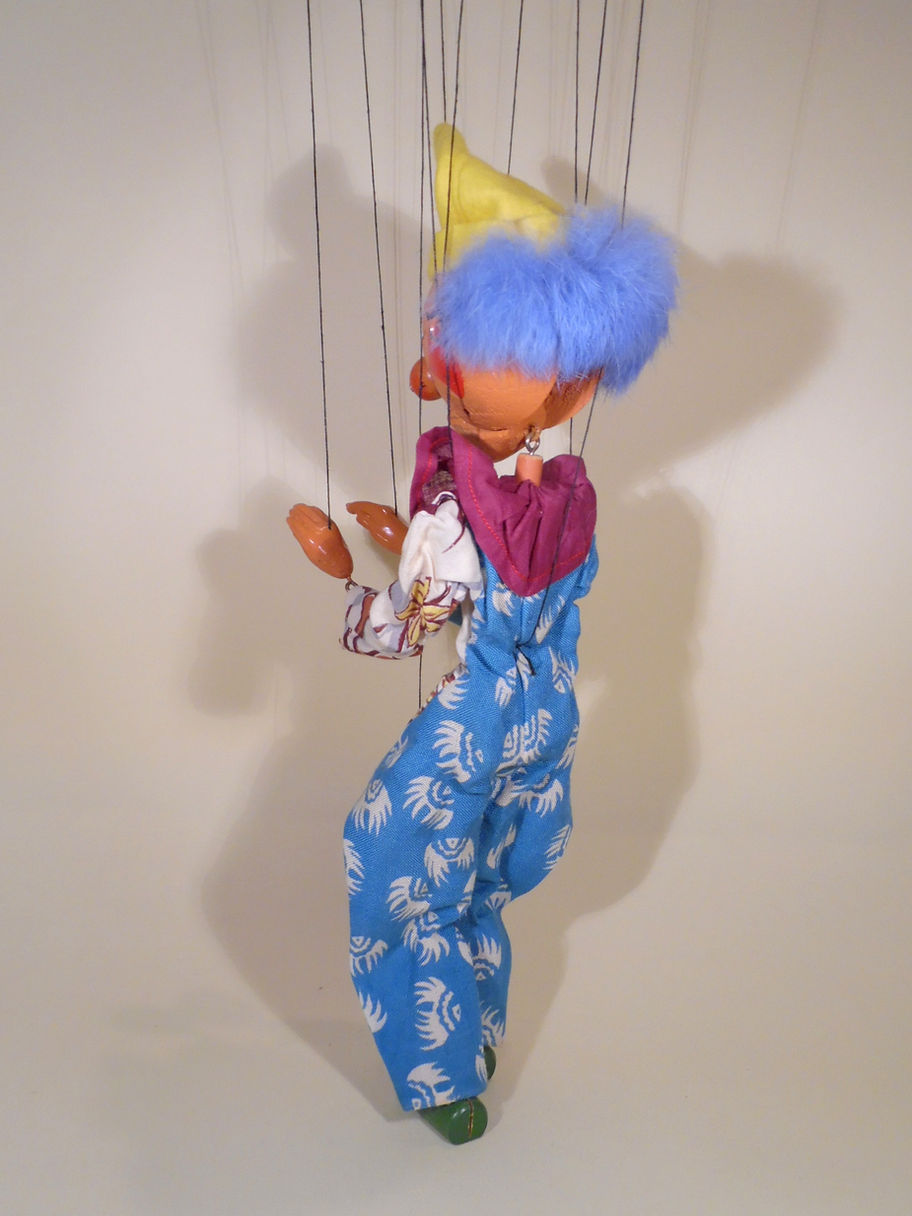 Type SM Clown dating to early 1950's. He is in very good condition with real thick fur hair which is a lovely shade of blue. The suit is good and the felt hat is also in good condition. The mauve ruff is in good condition. He has composition hands. The face paint is very good and he has a good fun expression with semi circle blue painted eyes. He retains a red felt tongue. There is an extra tummy thread for him to perform tumbles. The original box is good used condition, stamped correctly one end.