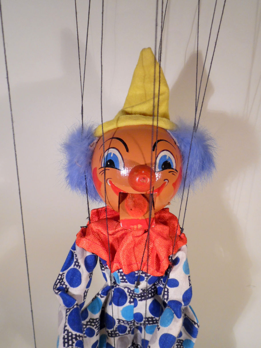 Type SM Clown. He has large lead hands and wooden legs. He has a wonderful face with face paint in excellent condition. He has full blue rabbit fur hair and felt hat with no damage. His romper suit is clean and bright, the ruff is also good. He retains a felt tongue. Clown has an extra tummy thread to enable him to perfom tumbles. The hand string is a little long, could be shortened if preferred. The box is marked on the end in pencil and on the lid by a child. A set of instructions and Pelup letter complete, are included.