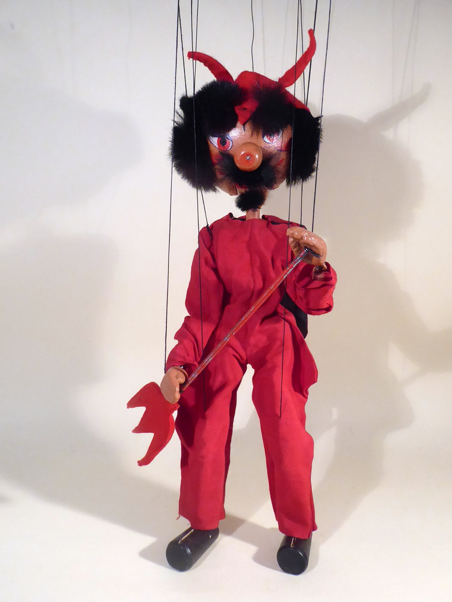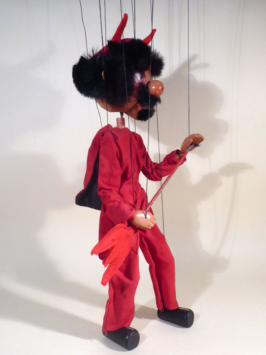 Type SM Devil 1950's carrying the trident. He has a very good red suit and cape with black lining. He has large composition hands and carries the trident which is in good condition with good felt. Earlier versions sometimes had the trident as a tail. He has a mass of real fur hair and has a beard and moustache of the same fur. He wears a devils red felt hat with horns, in good condition. The face paint is very good and the jaw opens well with a felt tongue intact. The original box is good, stamped one end. Instructions and letter to join the Pelpup Club are included.