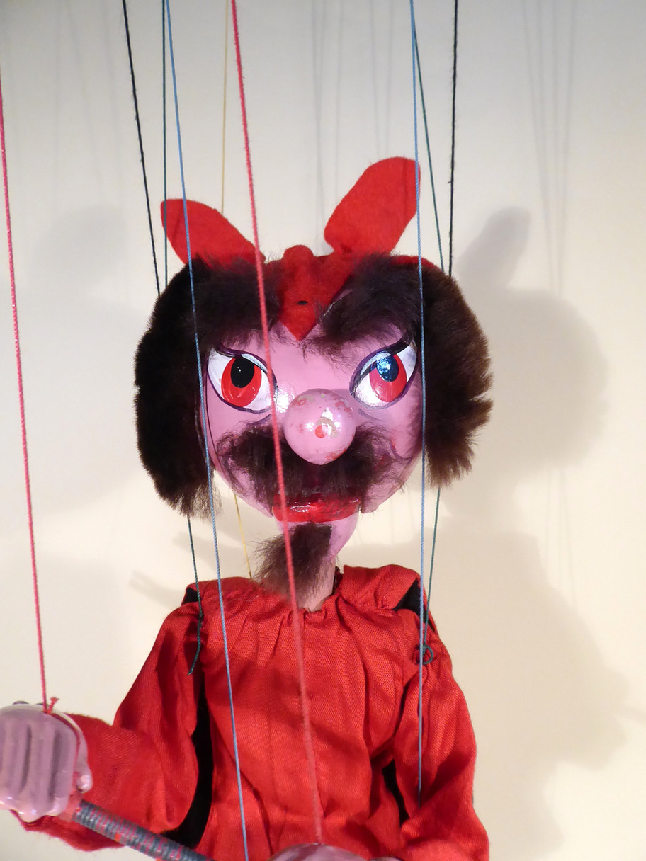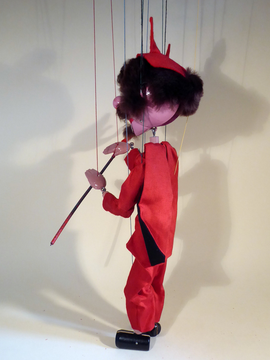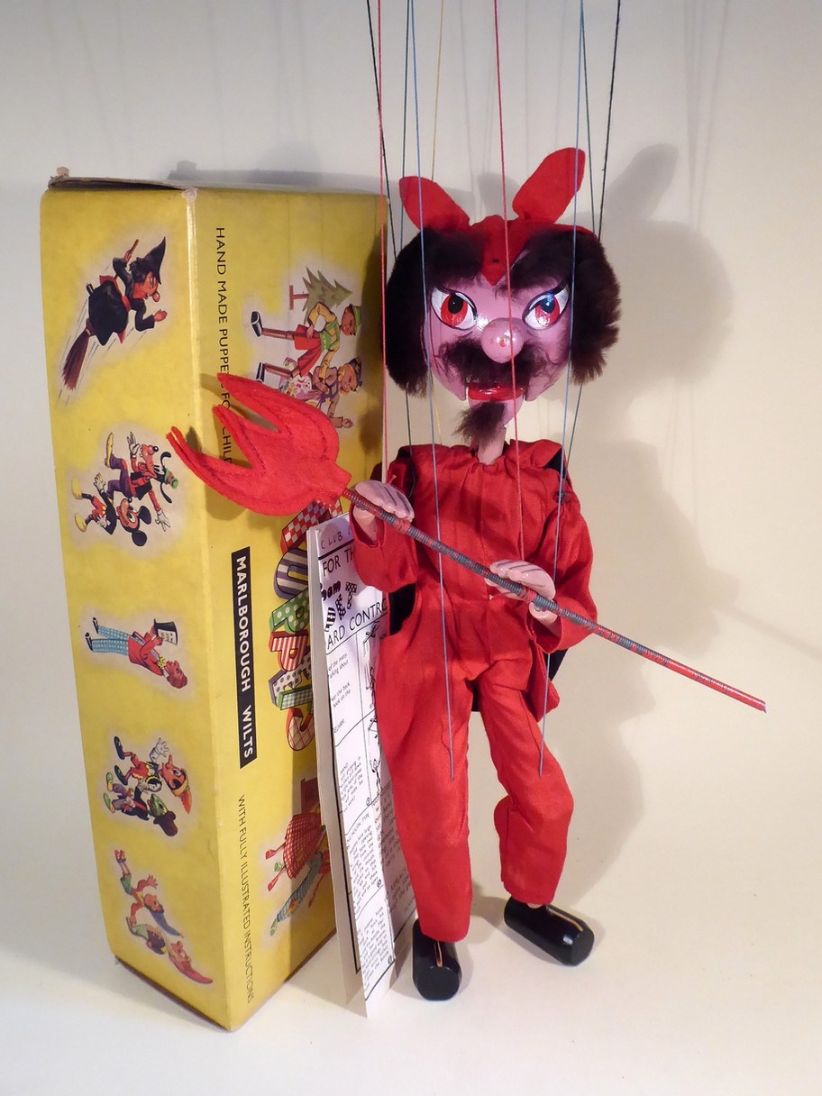 Type SM Devil carrying the trident. He has large orange painted eyes. This is the late 1950's version, strung on the 6" control with coloured buffers and coloured strings. He is in very good condition. The long trident has a good felt fork but has the usual paint loss from the metal coiled handle. The red suit and cape are very good, made from a satin type of material. He has a good mop of hair with moustache and beard still attached. He retains a red felt tongue. Face paint is good with minor loss on the nose. The original box is stamped but it is faint, although can still be made out.