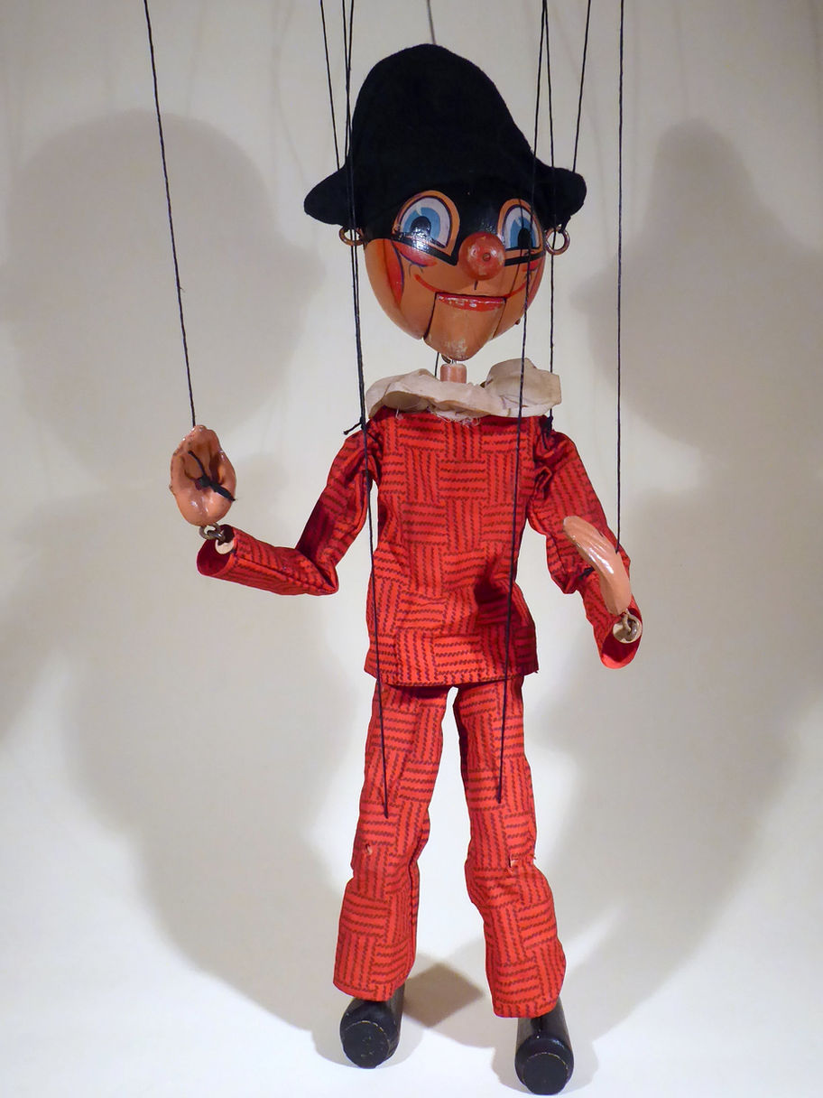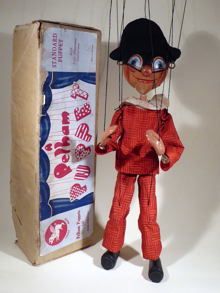 Type SM Harlequin 1950's in used worn condition. He has composition hands. The ruff is small organza type material and has two small holes at the side from ageing and wear.(see image) The black felt hat is in good condition and he has flock felt type hair. The facepaint has some wear and light scuffs on the nose and chin, see images, he has lost his felt tongue. The material of the suit is cotton and there are holes at the knees but not where the strings are, otherwise it is good. I think it could do with a gentle clean. Box is stamped for a different puppet and a handwritten name of another different puppet!