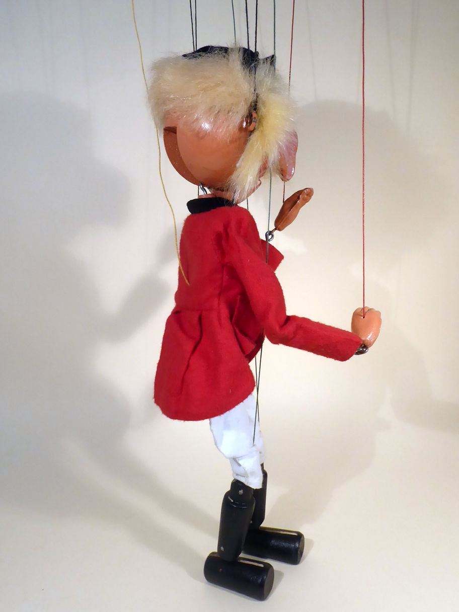Type SM Huntsman 1950's, one of the rarer SM type from that period. He doesn't often come up for sale. He has good face paint and hook nose but above this is some restoration to the wood, it looks like a wood filler. There is also some at the left side of his jaw but I have seen this type of material at the jaw before so not sure if this is any restoration. His mouth opens well. The puppet has moth damage as often happens with this puppet. The yellow waistcoat in particular has suffered. The red coat is good. He wears a cravat tucked in to the top. He wears a black felt riders cap with small blue felt bow attached. The cap has no damage. The white breeches are good with no significant damage. The felt tongue is still intact. He has typical Huntsman character fair hair which is very good and also a small moustache. Eyebrows are intact either side of the repair. Strung on coloured strings with aged buffers. The box is original to the puppet and is stamped Type SM Huntsman. Instructions included.