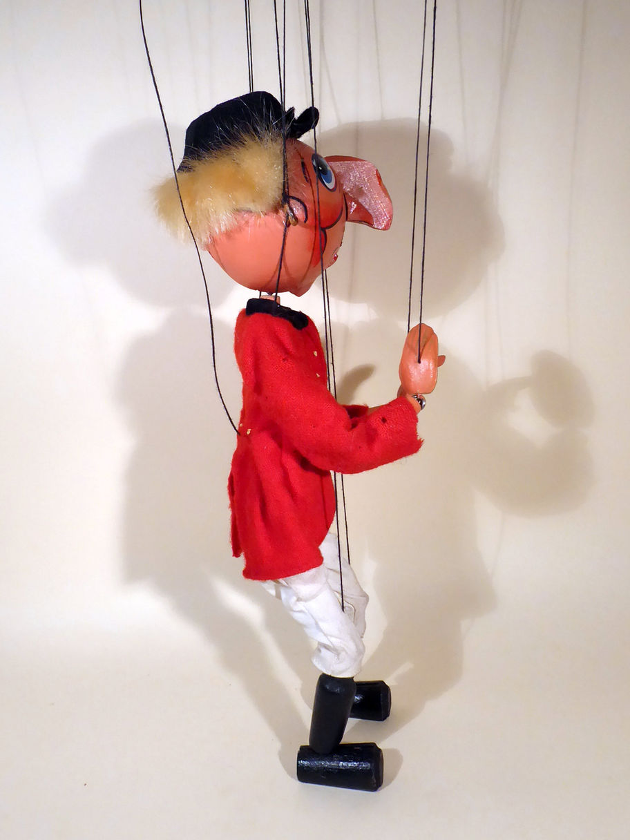 Type SM Huntsman. He has come to the shop from the original first owner so has never been seen for sale. It is in very poor condition with moth damaged clothes and hair, but it is a rarely found puppet so should be good for restoration and treatment. He has lost a wooden nostril and the large carved wooden nose is loose, it is attached by the original nail. The fur hair is aged and would come off the wood if pulled, it may need replacing. He has no moustache, it is missing. The black cap is aged and brittle, I have lightened the image to show the bow still on the peak. The red jacket is moth eaten and aged. The yellow waistcoat has a few holes at the bottom edge. The white trousers also moth damaged on the edges of the wood parts. He has a good cravat. He has large composition hands which are perfect replacements and black painted wooden boots. The blue label box does have a very faint stamp I think but is illegible, it does have Huntsman handwritten on the lid. It is shelf worn and dirty.