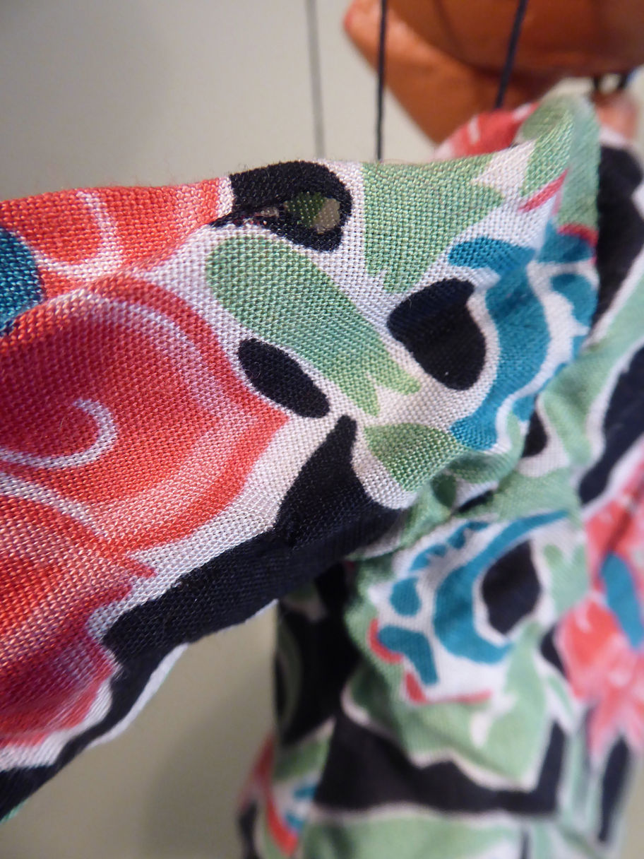 Type SM King late 1940's/early 1950's with a colourful costume. He has large lead hands. He has very good face paintwork. The black and white painted shoes are worn, this style of painting was on the early versions. The hair is a little aged. This character can be sometimes be seen with facial hair but there is no evidence of scuffs in paintwork where any would have been. He has a damaged old felt tongue. He has a good card and wood crown, earlier versions sometimes had a wooden ball on the top. The pretty waistcoat is good, the jacket has some holes on one sleeve near the shoulder, these don't show on display. Screw eyes on control are rusted. Box is stamped SM Clown so has been mixed up at some time. Puppet has come from original owner in a small collection.