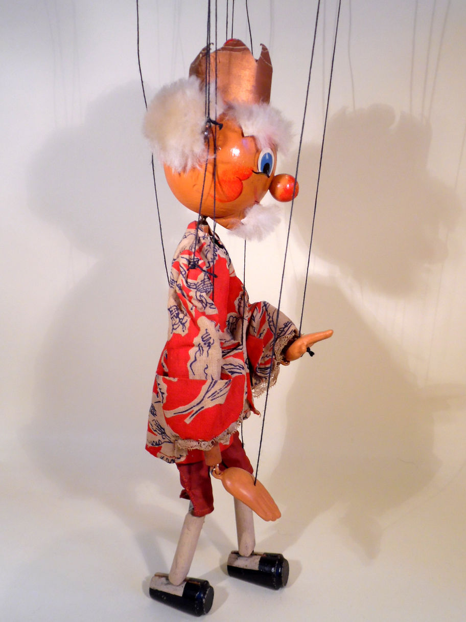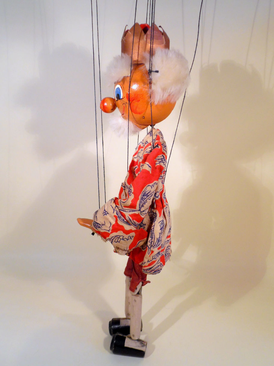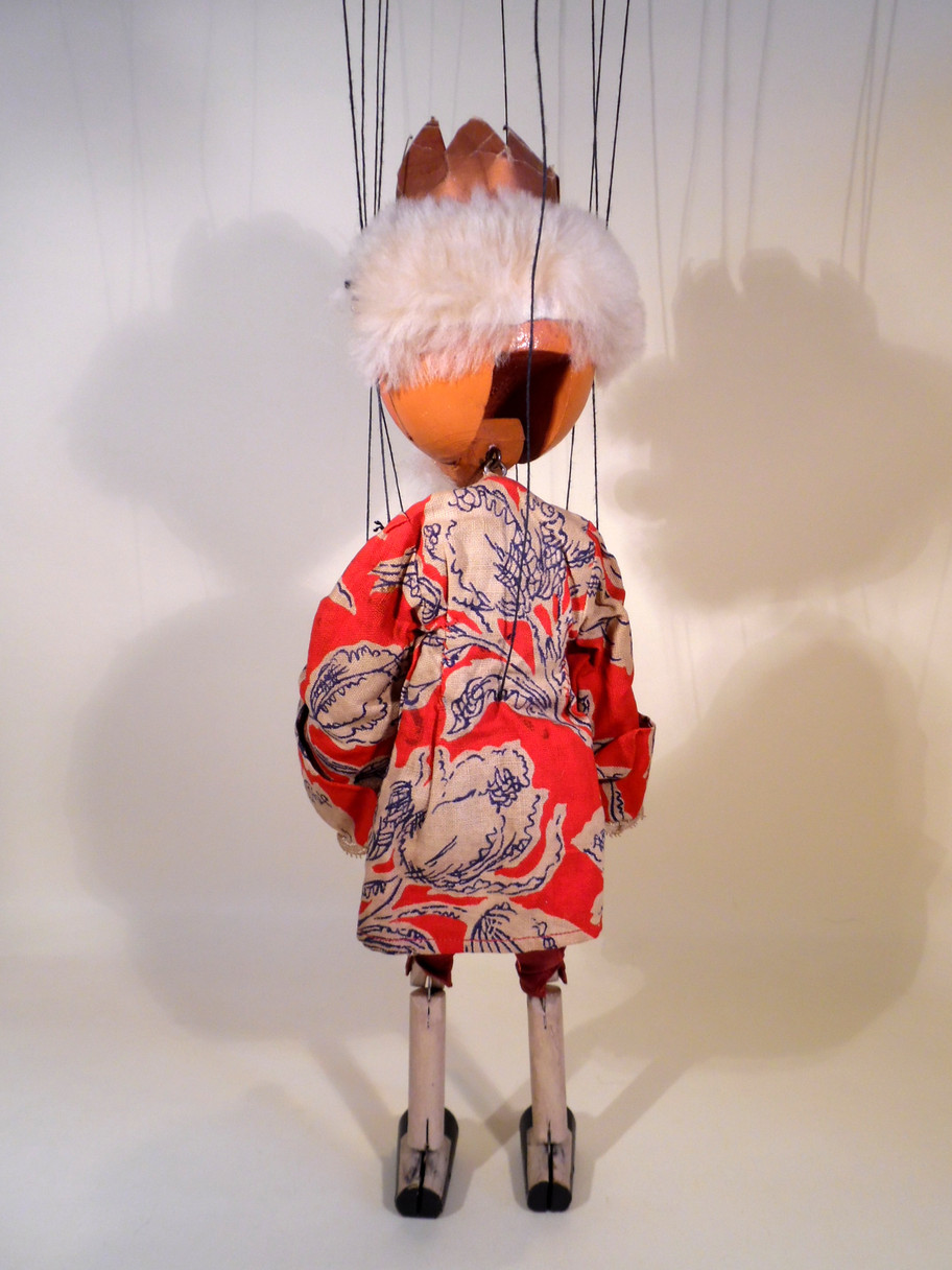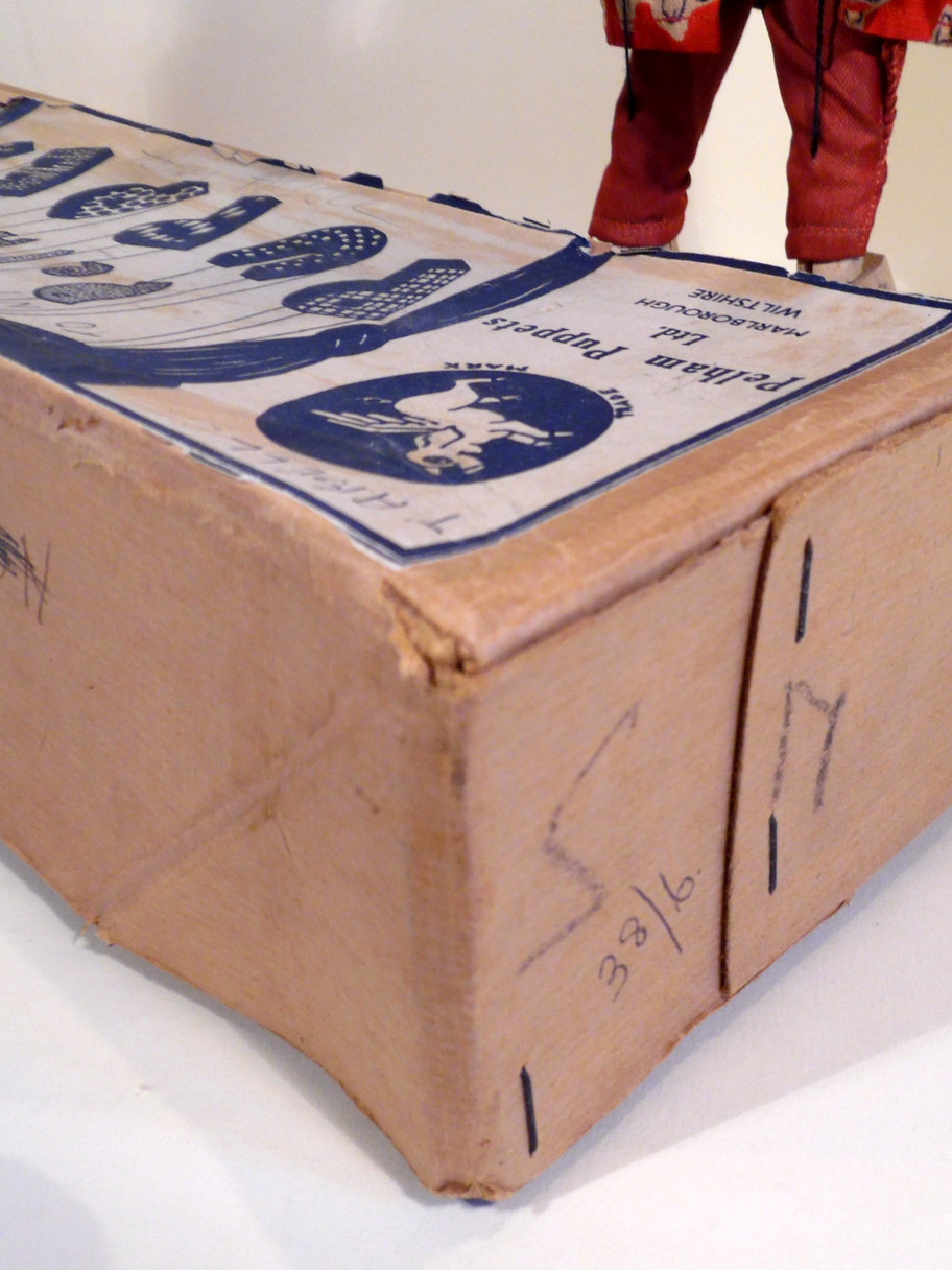 Type SM King 1950's in very good condition with some general dustiness/ageing. No felt tongue. He has amazing soft fur hair on his eyebrows and beard and an unusual early style crown with a different wooden part inside the card crown. The face paint is lovely and bright, clothes amazing red hues. Composition hands. He has two tone shoes. Box is poor shelf worn condition with splits, marked with pencil SM one end. Instructions and letter included.