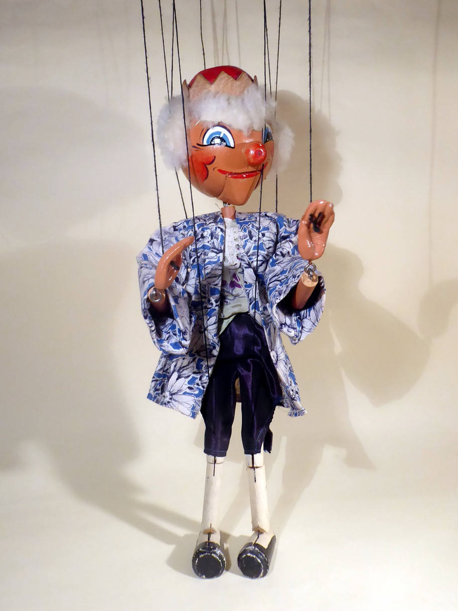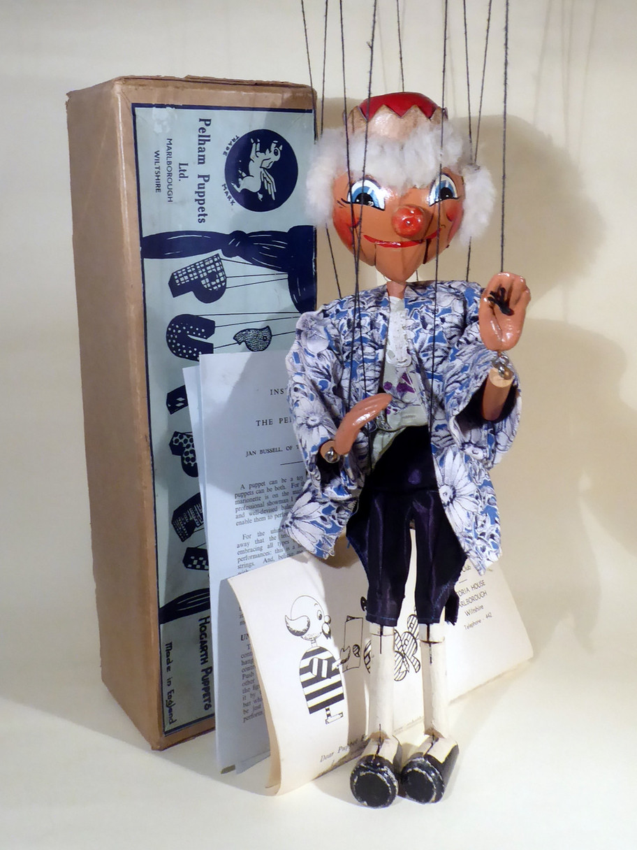 Type SM King, one of the rarer late 1940's early 1950's characters. He is in very good condition. The face paint is good, a minor scuff to his right eye barely noticeable, and he retains a felt tongue. The mouth opens well. The clothes are all very good with no damage. His golden crown is very good with no damage, it is made from stiff card or it might even be a hard leather, I am not sure. Shoes show he has been played with, they have sme scuffs in the paintwork. They have the two tones colouring which shows they are from the first versions. later types have plain black shoes. The real fur hair is full. The original box is stamped one end. Instructions and letter to join the Pelpop club are included.