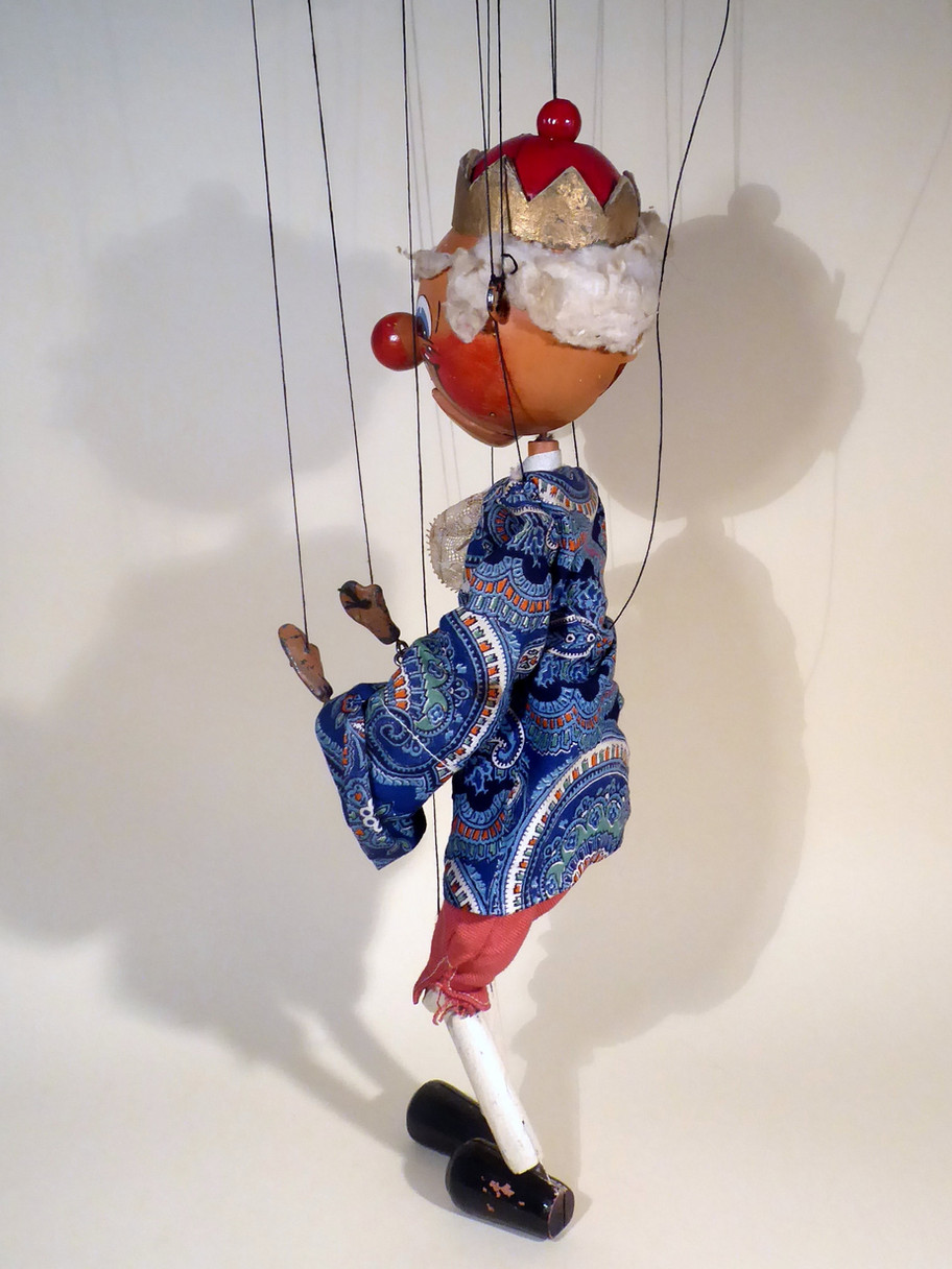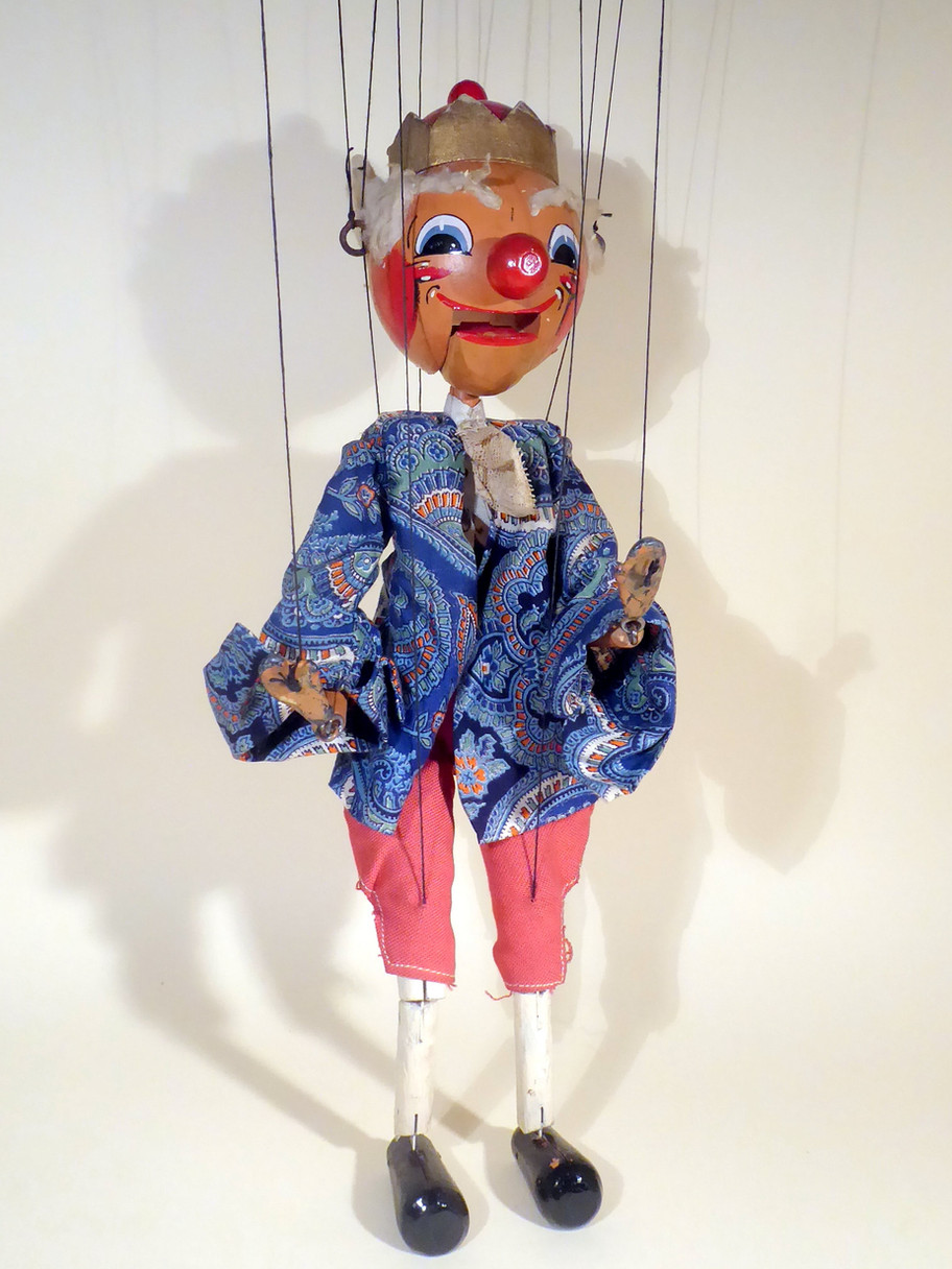 Type SM King, a very early version from late 1940's. He has wonky style toggle upper legs, the top part painted dark brown. The lowerer body part also wonky era style. King has very good face paint and a jaw that opens well showing his felt tongue intact. He has a card crown and wooden dome with a round ball on top, only seen on the very early Kings. He has poor aged cotton wadding wool type hair, the same for eyebrows too. He has drop lead hands. The trousers are stuffed which is unusual. I have tried to see what they are stuffed with and it seems to be the same old cotton wadding as his hair. The jacket has wide sleeves and cuffs. It is in good condition with minor ageing where screw eyes have rusted underneath. There is no undershirt only a cravat and material at the neck. (See image) It seems odd this is missing as there is no damage to the other clothes. The lower body piece feels like the wonky style bodies with the toggle upper legs. The control is an early type and he has been restrung on thin black linen thread. Box is stamped correctly and is in used condition. Puppet came from original owner with the Dandy puppet sold last week. (box was one from stock that suits perfectly)