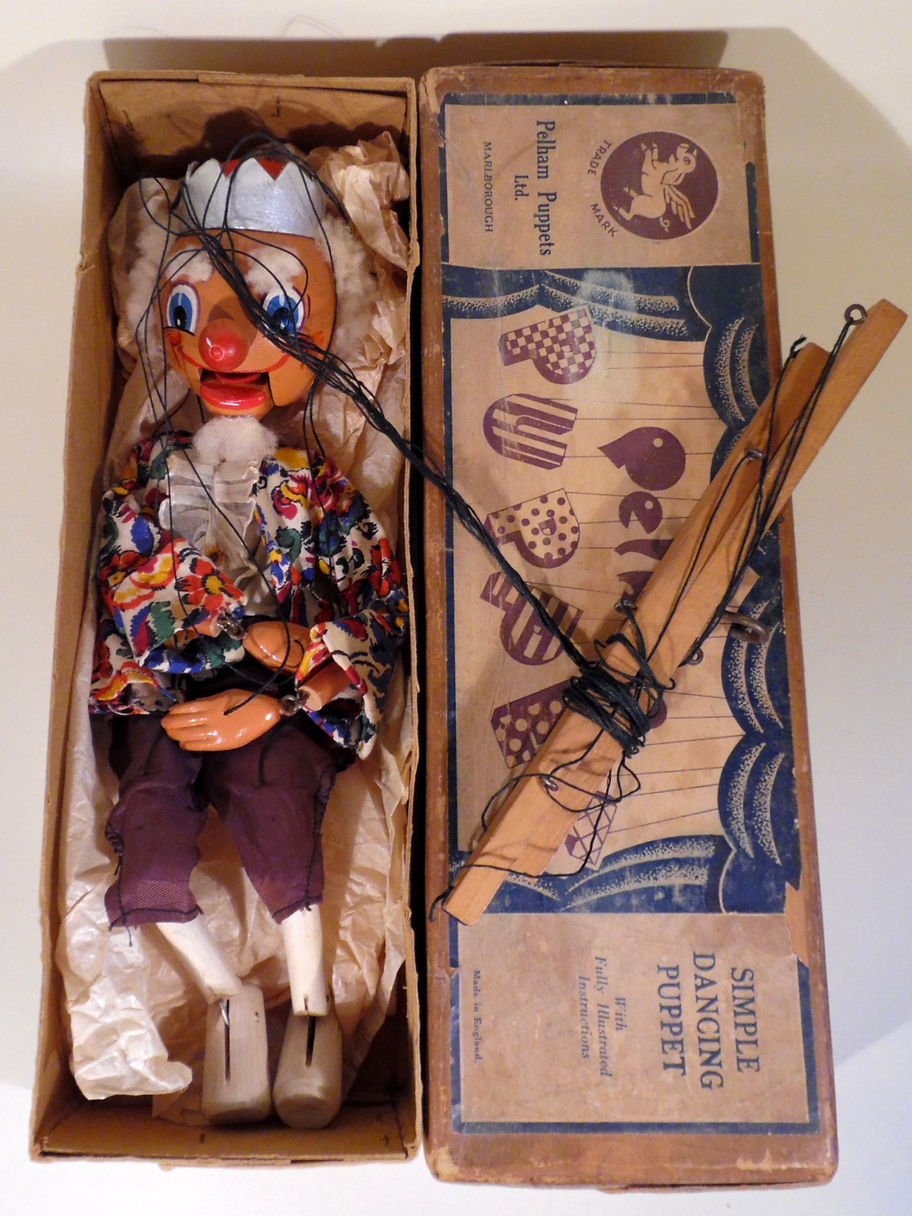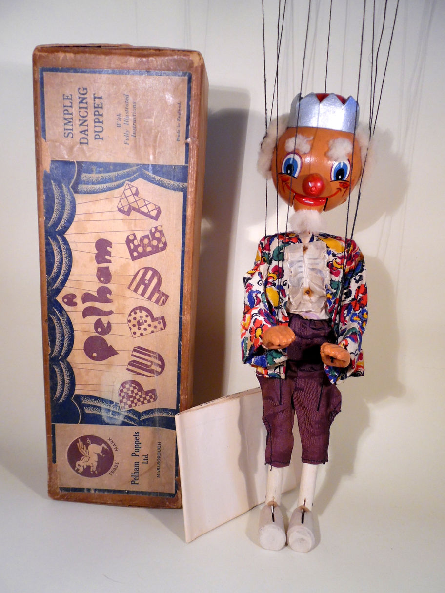 Type SM King 1950's with a colourful jacket and costume. He is a lovely character, he has his eyebrows and beard still intact and sheepskin hair. He has a very good face and expression. The King has suffered from moth damage and the trousers in particular have holes around the body part. Rust stains around metal pins on his bodice as seen. Box is the stamped over another stamp Type Old Man but the box is for a simple dancing type rather than Standard type puppet. It is shelf worn. Instructions included.
