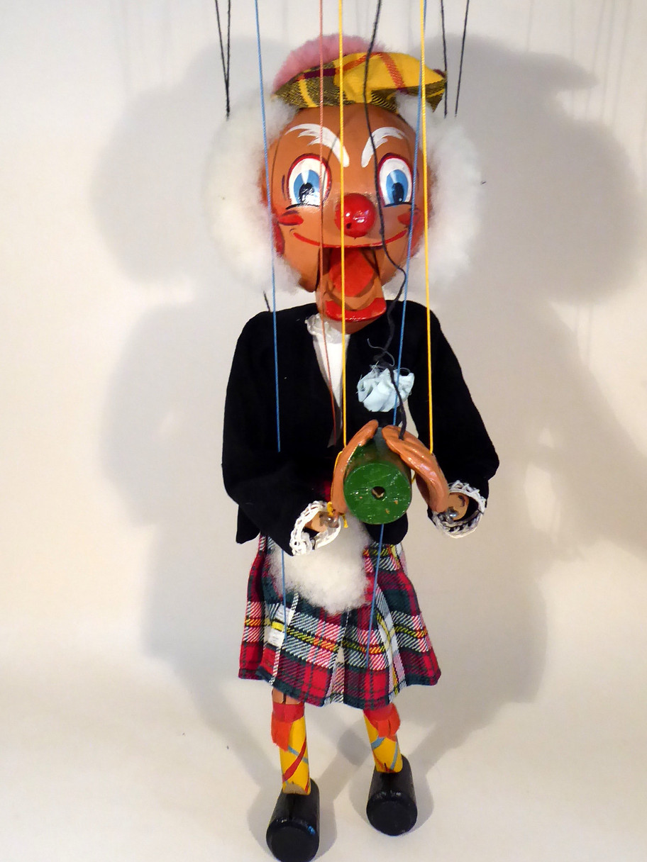 Type SM MacBoozle dates to early 1950's. he is in lovely condition with bright face paint and bright excellent clothes. The beret is a tartan material rather than the usual felt, with fur pom pom attached. He carries his bottle and hanky in his pocket. The kilt tartan hasgood colours. The thick red felt pieces on his socks are very good. The fur sporran is attached to the kilt. The original box is very good with correct name stamp one end. It has a split on one edge. A letter to join the Pelpup Club is included.