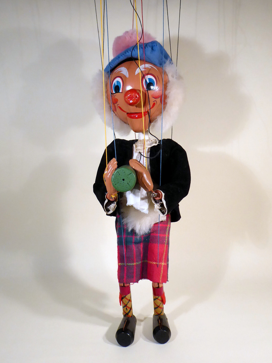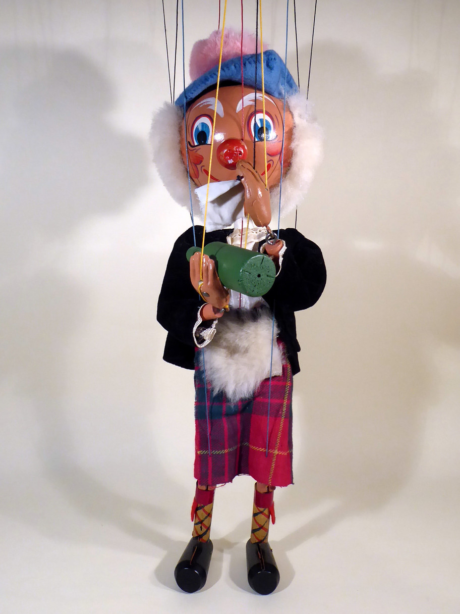 Type SM MacBoozle dates to 1950's. He is in very good used condition with bright face paint and good clothes which show very little signs of age. He has a lovely friendly smile! The felt beret has some minor moth bites, nothing that shows or is too significant. The big real fur pom pom is good. He carries his bottle and the hanky in his pocket. The hanky is good. He retains a red felt tongue. He has real fur hair, some of this 1950's character have synthetic fur. It is slightly thinned on the lower edge. The sporran is also real fur. The red felt pieces on his socks are good. The original box has a split and the label was very damaged so has been carefully reglued where the pieces had come away. Instructions included.