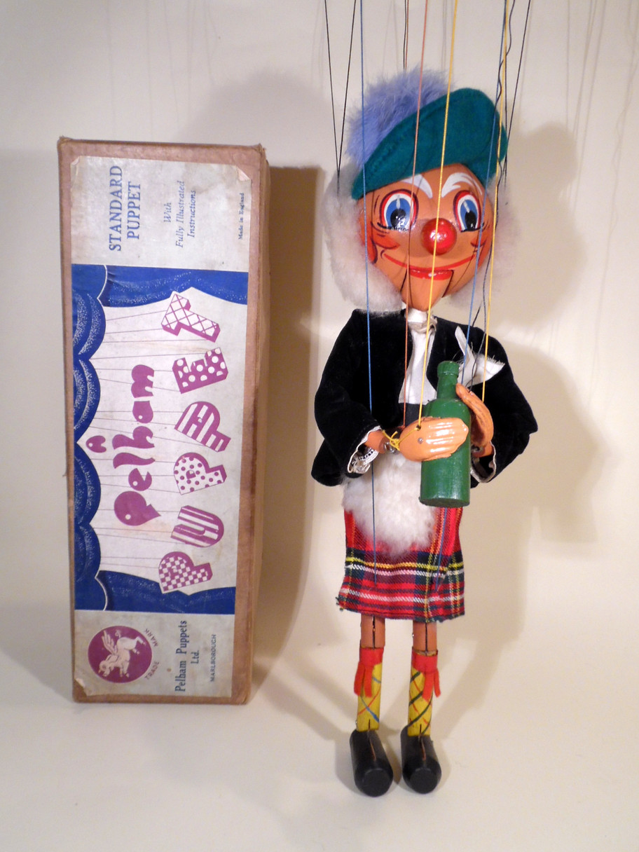 Type SM MacBoozle 1950's in very good condition. He has very good bright face paintwork and good clothes all round. He carries his bottle and hanky. He lacks a felt tongue. His sheepskin hair is very good. He still has a fur sporran. Box is stamped SM MacBoozle and is in good condition.