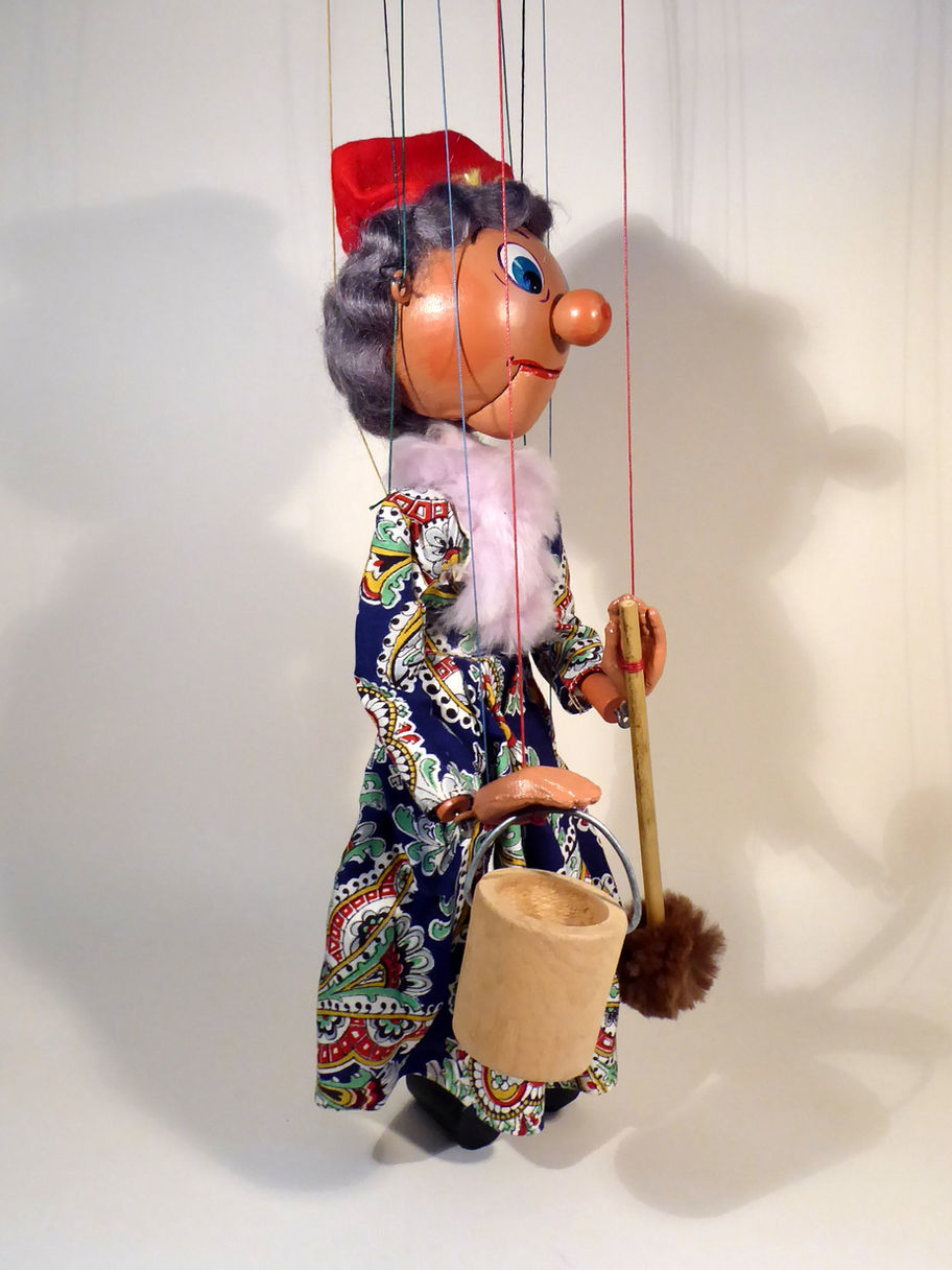 Type SM Old Lady dates to the mid 1950's. She is in very good condition. The thick felt hat has no damage and has the remnants of a feather, I will include a couple of similar yellow feathers, to be added if preferred. The dress is a nice fabric design and just has a small wear hole, barely visible. She has well styled grey hair. The face paint is good and she retains a red felt tongue. She carries a wooden bucket and mop. Earlier versions would not have had this. This bucket has no blue felt to look like water. Strung on coloured strings, the buffers are quite well worn. The box is poor with no name stamp one end. It has a split one end, but is the correct era and style. Instructions and new anti tangling device instructions are included.