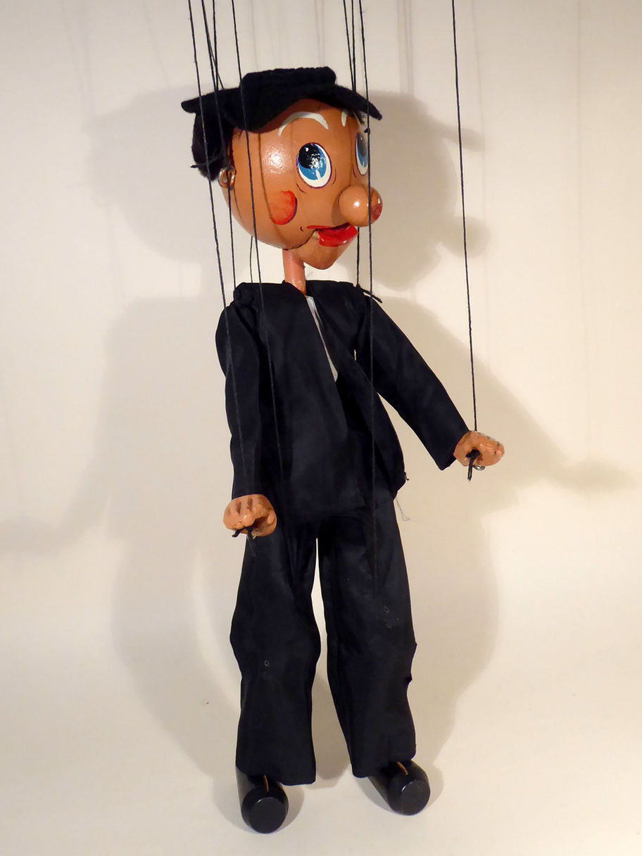 Type SM Parson, one of the rarest SM type characters from early 1950's with large composition hands. He is in used and altered condition. The Parson has been a different character on stage and so, his dog collar has been removed and the black shirt under the suit has been cut away from the trousers. The small piece of material is still in the box.The wood upper body part under has been painted white to look like a white shirt. The piece of original shirt material has been cut away so is frayed but there might be enough to make the shirt again and attach a new dog collar. The jacket is good, the trousers have a few small holes as shown. The felt hat has one very small pin prick hole, otherwise is good. He has real fur hair underneath, please see images. I think the fur hair is replacement, although it was believed to be original. Eyes are looking upwards, special to this character. The face paintwork is very good. He retains a felt tongue. The mouth is stiff and needs attention to work properly. His head flops forward so I think the screw eyes need some adjusting. The black shirt replaced and white tape around his neck. I would probably try to change the hair to flock or tight curly hair, but maybe I'm wrong, I have seen this character with real fur hair before at auction.There is some black paint at the back of the head and I'm not sure where that has come from. Strung on SM type control with black thread. Some images have been lightened to show any damage on the dark clothes. Box is in shelf worn condition. Stamped Type SM Parson one end. I think he could be altered back to his original self fairly easily by a collector although he does sound as if he has a lot of faults in this write up. I've tried to add lots of images of where I see the defects.