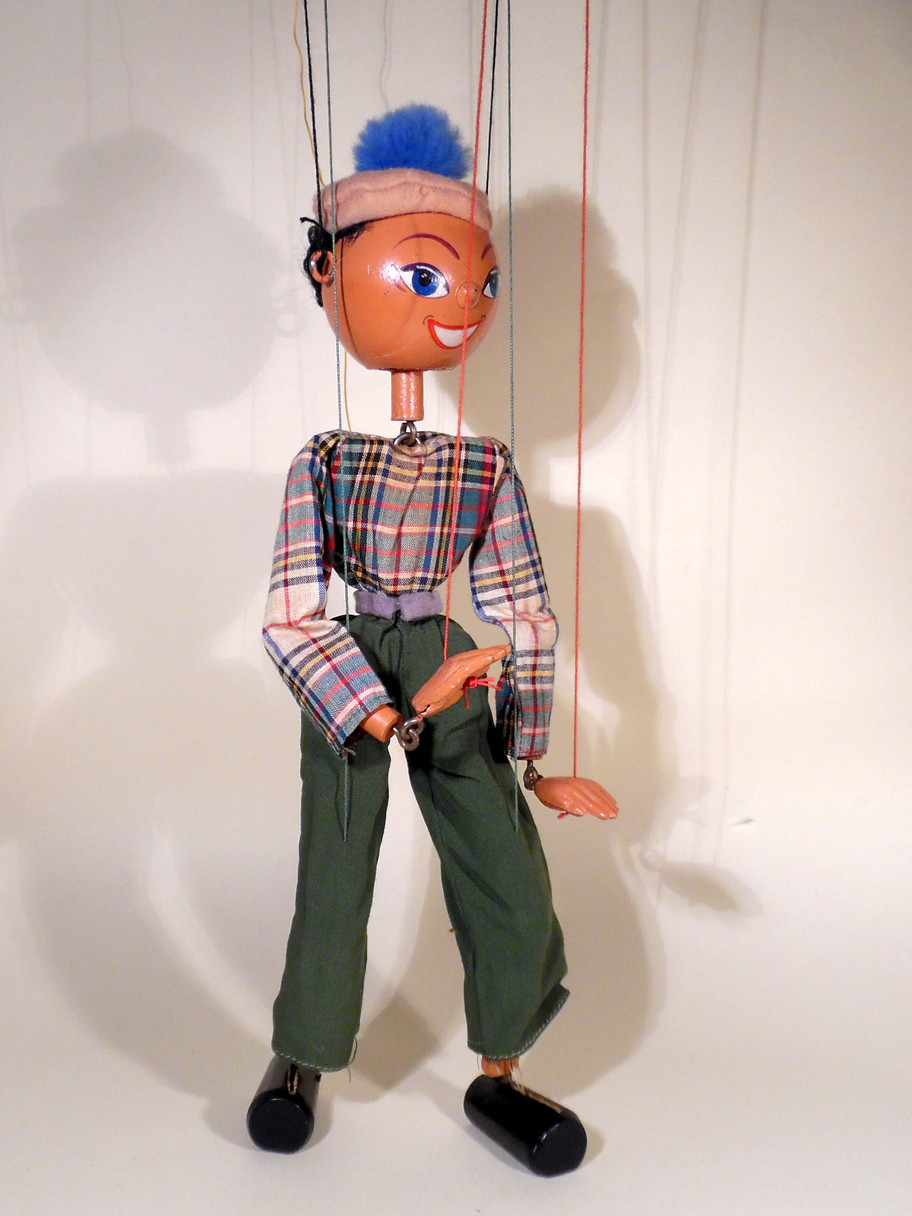 Type SS Boy 1950's with wooden legs and small composition hands. His clothes are very good with small real fur pom pom on his felt beret. Re strung on small 1950's control. No box.