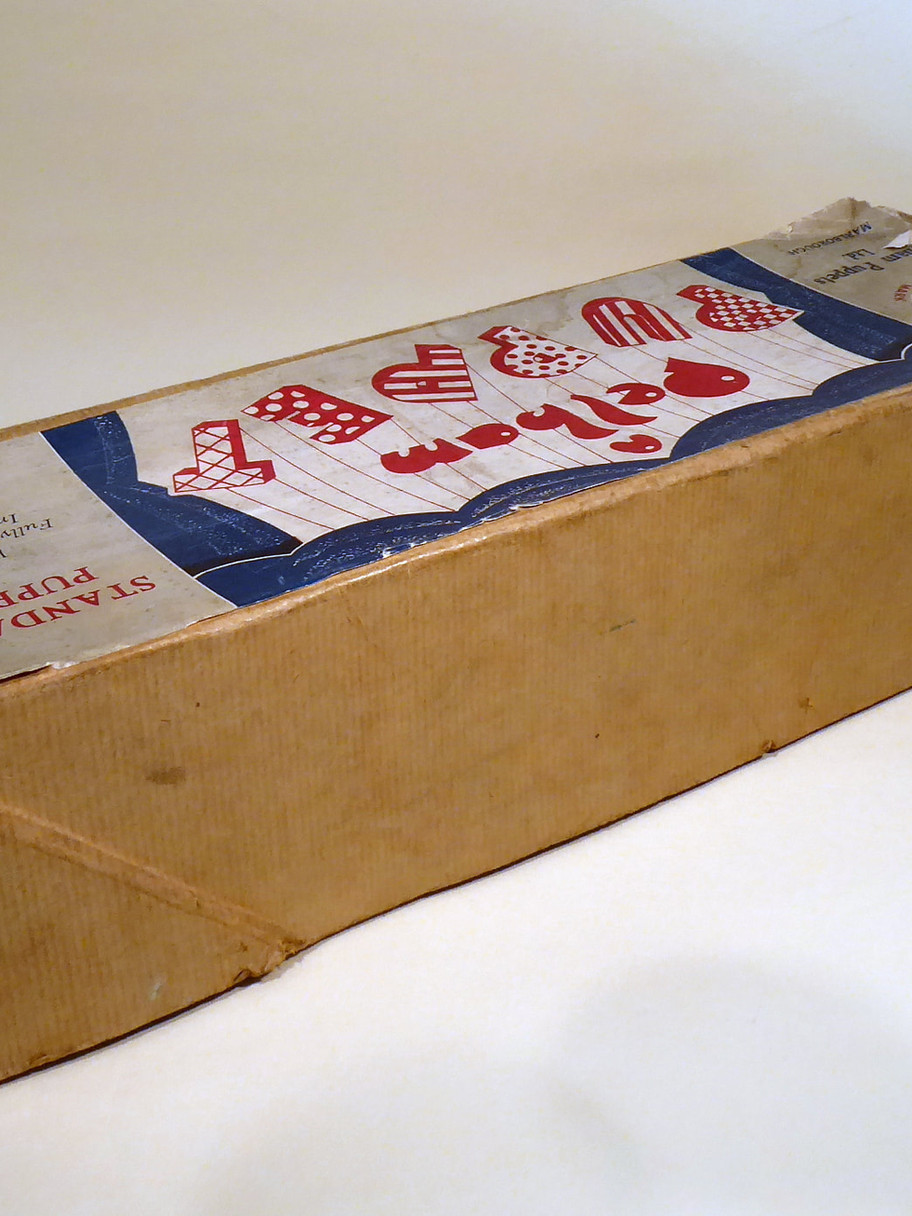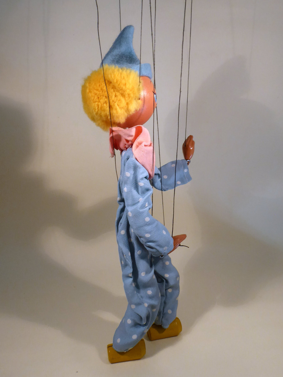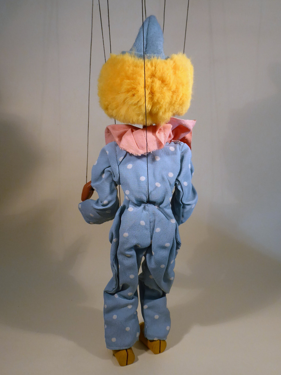 Type SS Clown, 1950's era. He has a lovely coloured costume. Clothes are clean and fresh. The felt hat has no damage. He has real yellow fur hair. The box is stamped correctly and is in used condition.