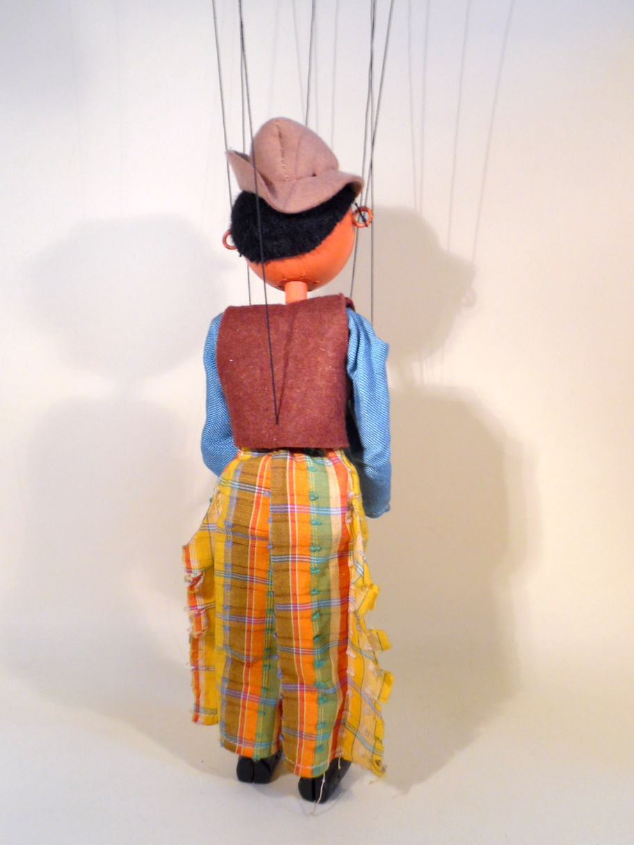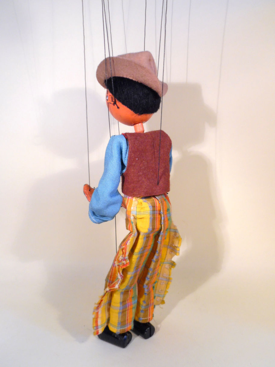 Type SS Cowboy with lovely bright seersucker trousers. He wears chaps with a waistcoat of felt and thick blue shirt. The clothes are good, the very thick felt stetson has minor moth hole barely seen on the front. He has paint loss on his nose as seen. He has small lead hands. Box is good with Cowboy written in pencil.