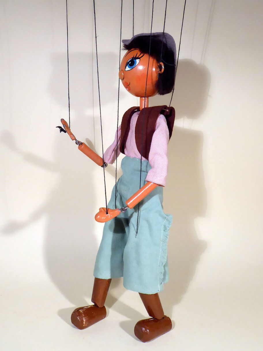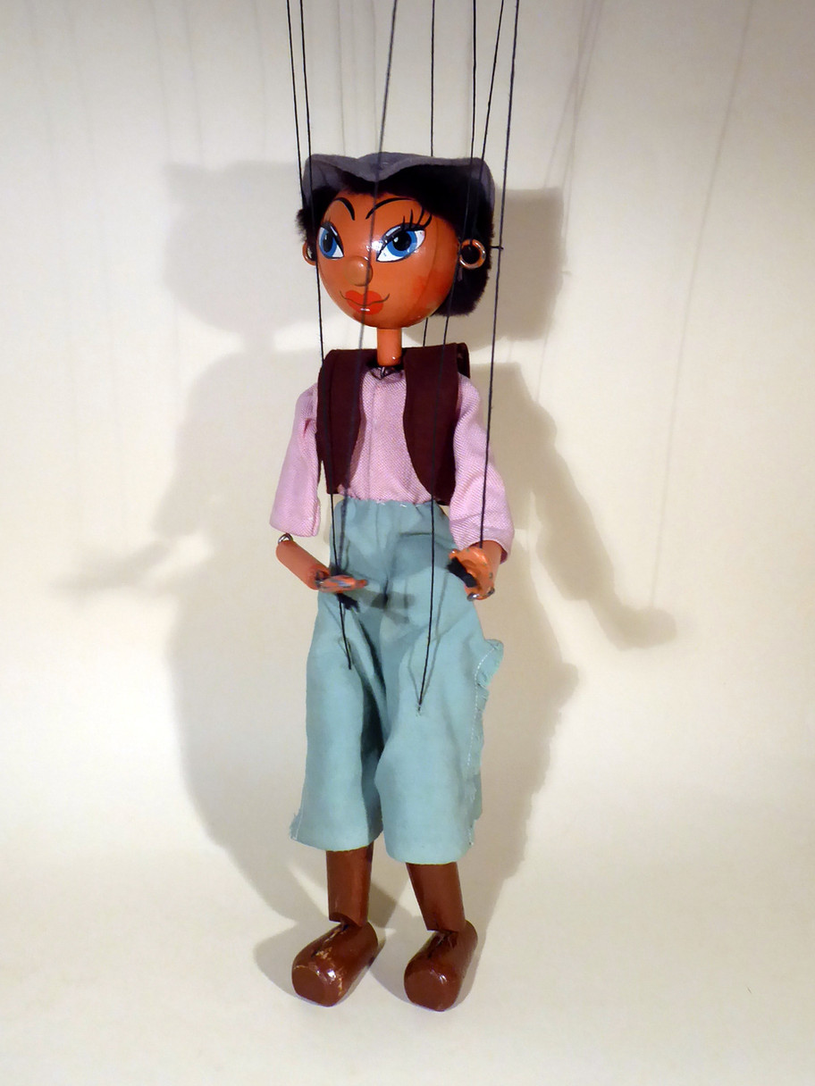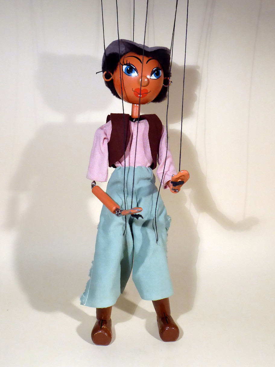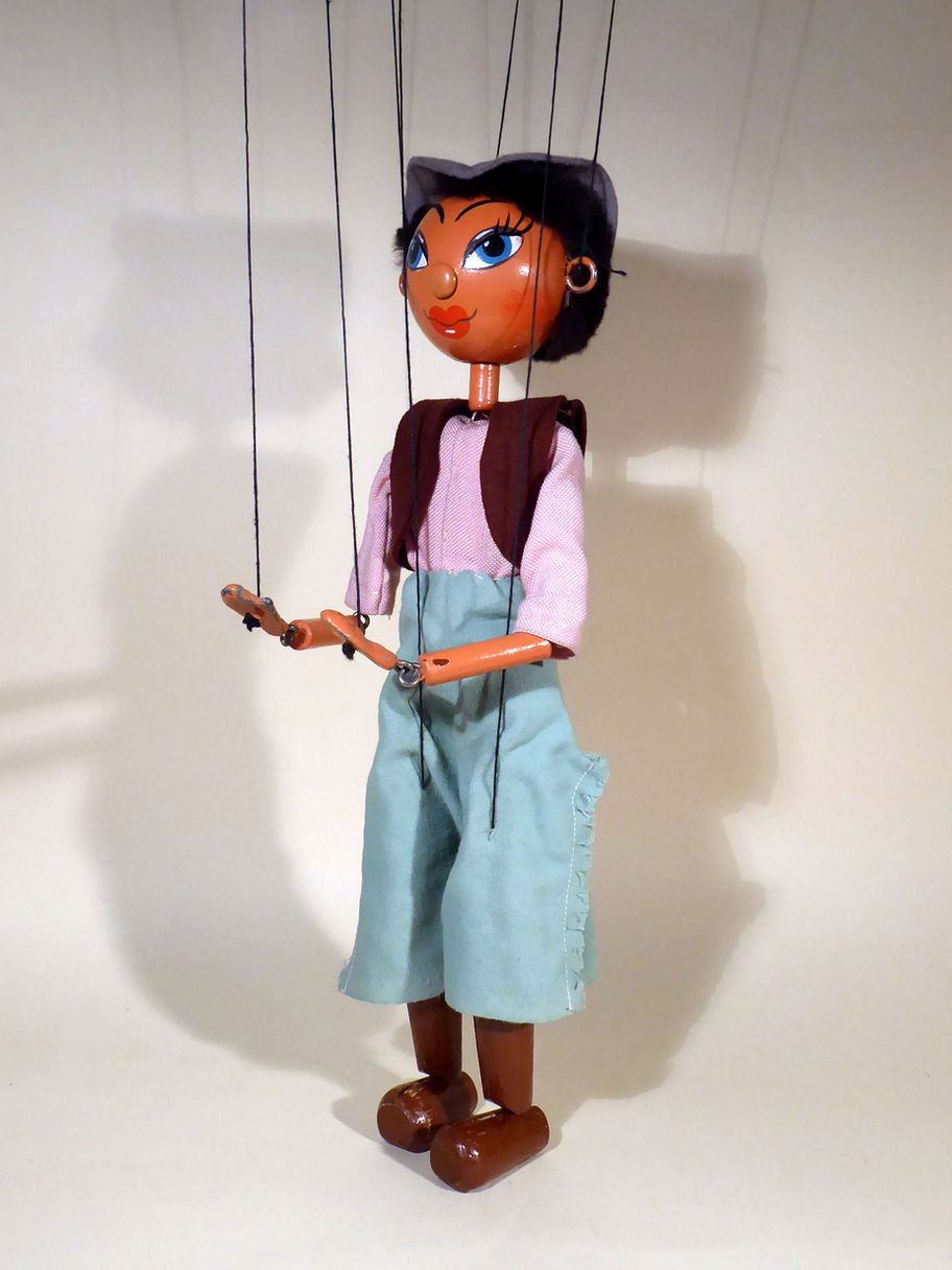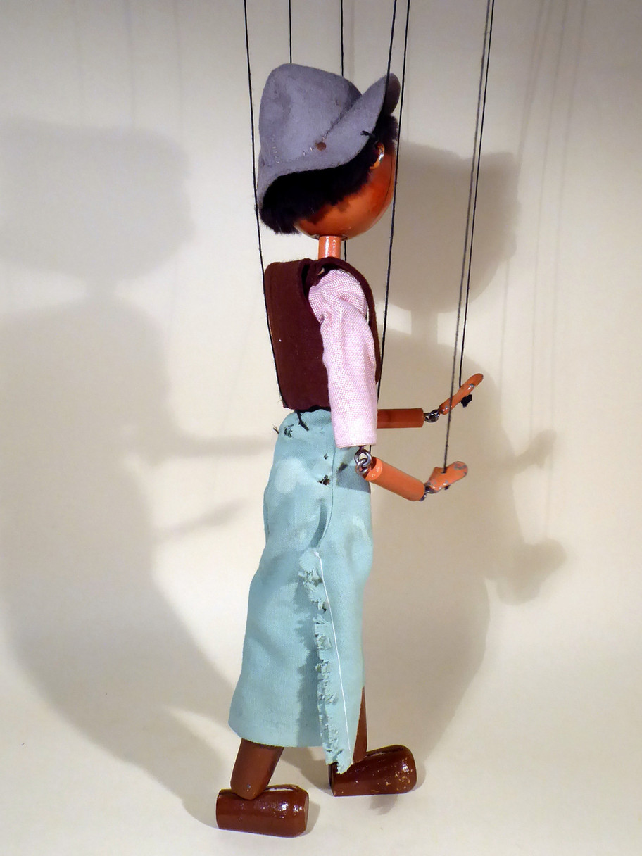 Type SS Cowgirl dates to late 1940's with small lead hands. She has a lovely face with no paint loss. The fur hair is good and her felt hat has no holes. The costume has some moth damage at the right side hip as shown in the images. The rest of the costume is clean and in good used condition. She wears cowboy boots and trousers with a fringe. The puppet has only had one owner. The original box has a price of 27/6 on one end, it has no name stamp.