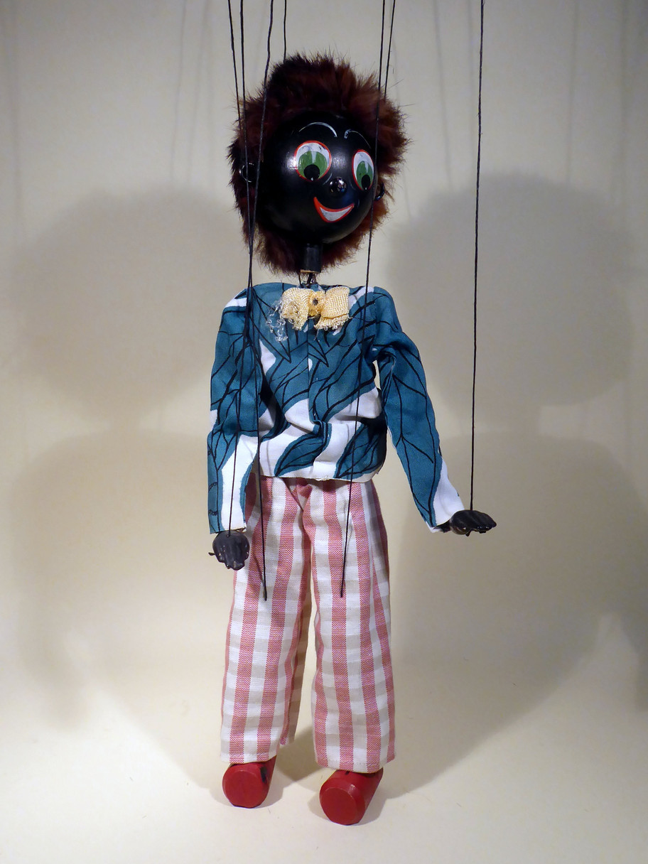Type SS Golly, he is in used condition. There is black paint on his shoe which would probably have occured at time of manufacture. He has rabbit fur hair, it has the join seam showing. Trousers are good, top has minor wear. Bow is frayed. The nose has paint loss. Hands look as if they may have been repainted.
