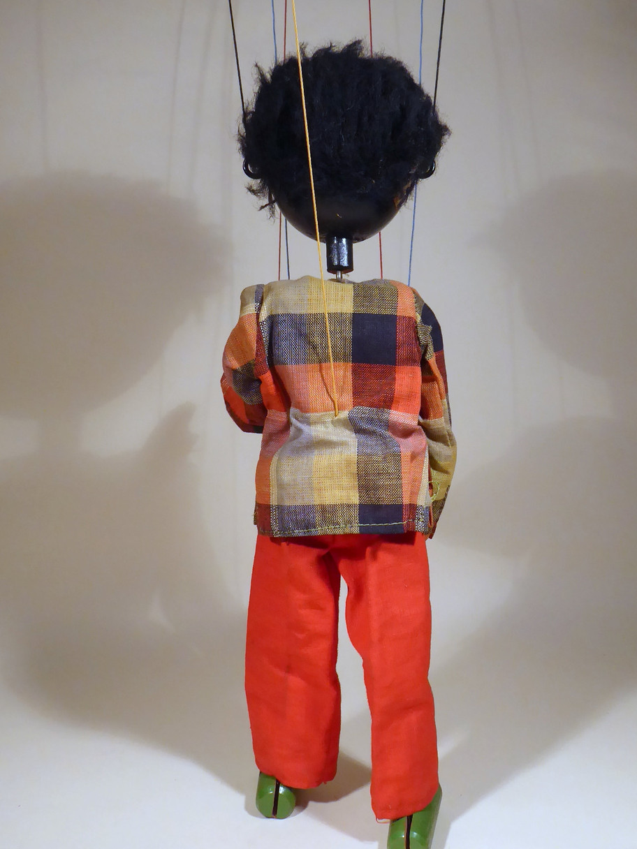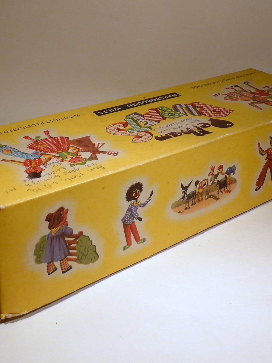 Type SS Golly 1960's era. He is in good used condition, a little dusty. He has composition hands and wooden legs. Hair is synthetic, the face paint is good but for a little loss around the metal pin nose. Box is stamped correctly and instructions are included.