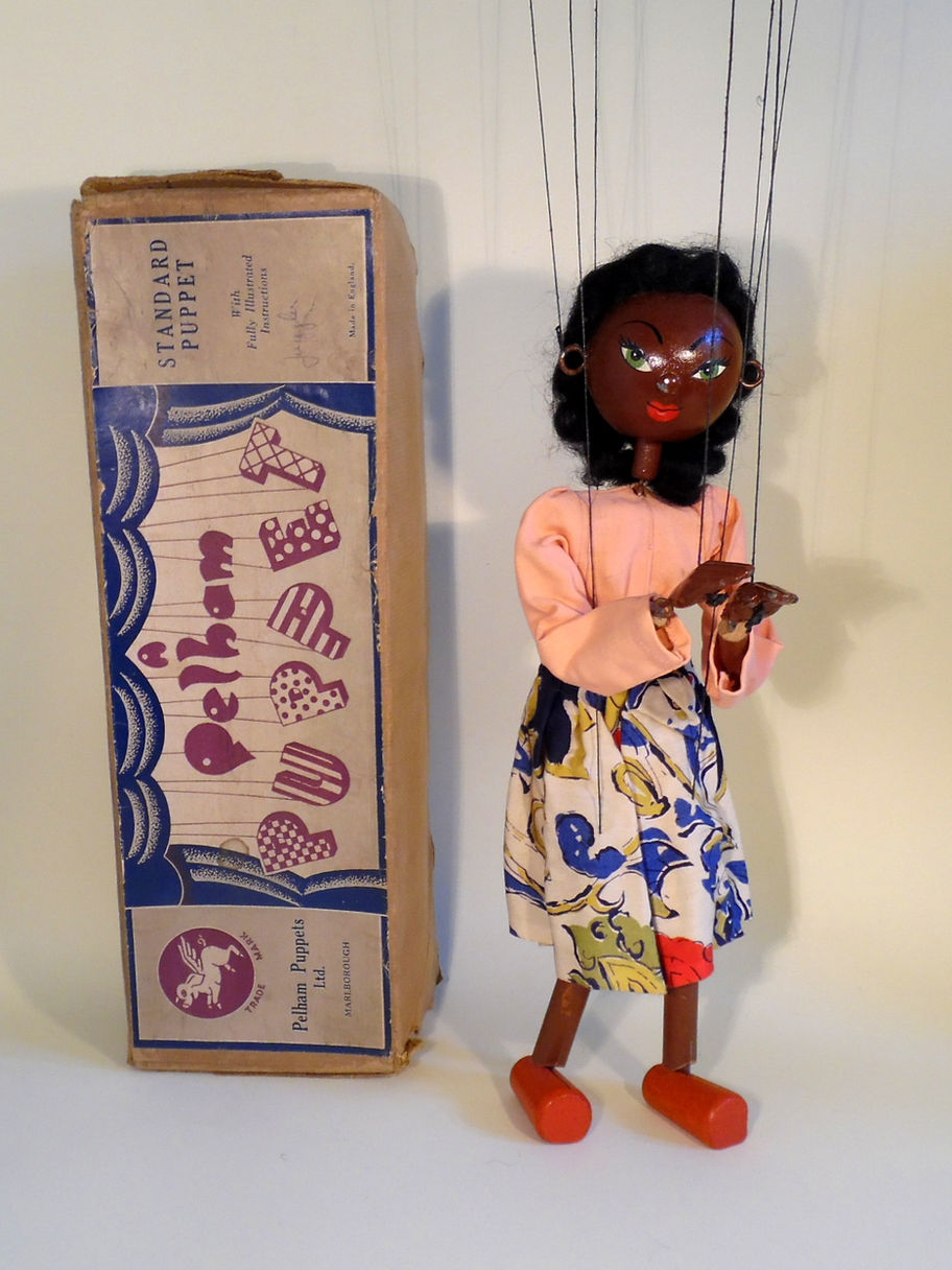 Type SS N Girl in good condition. She has paint loss on her nose but otherwise has no damage. The clothes are good with minor ageing marks. She has lead painted hands and wooden limbs. The LS type is more usually seen. Box is unstamped with splits.