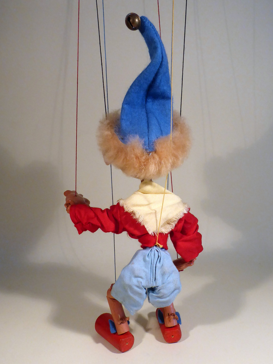 Type SS Noddy 1950's. The puppet is in very good condition all round. The shorts are a little dusty and the bell has a little rust, otherwise he's very good. Box is faded with correct name stamp one end.