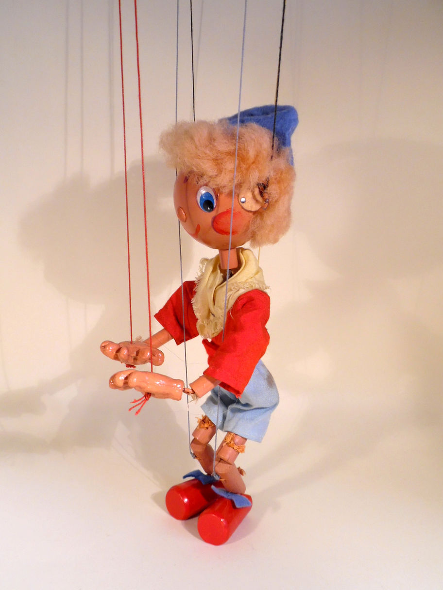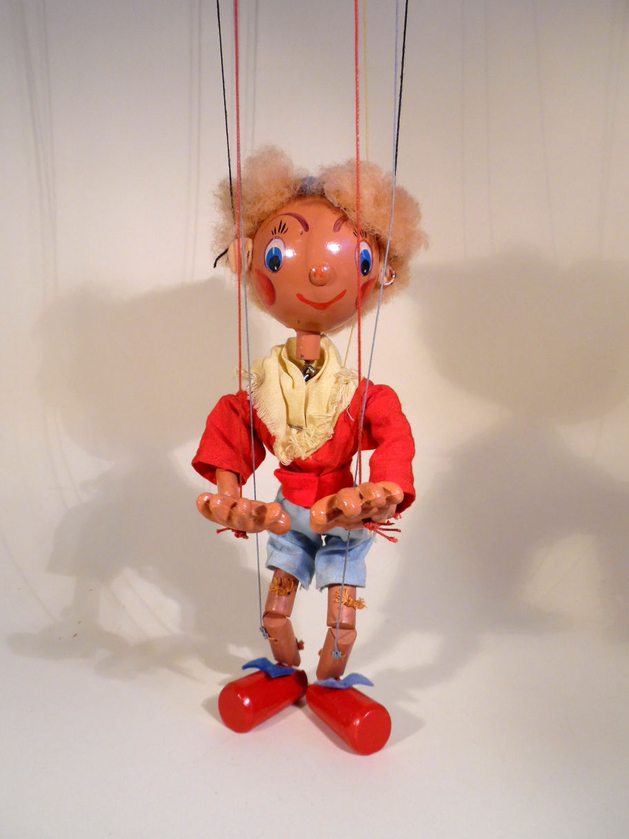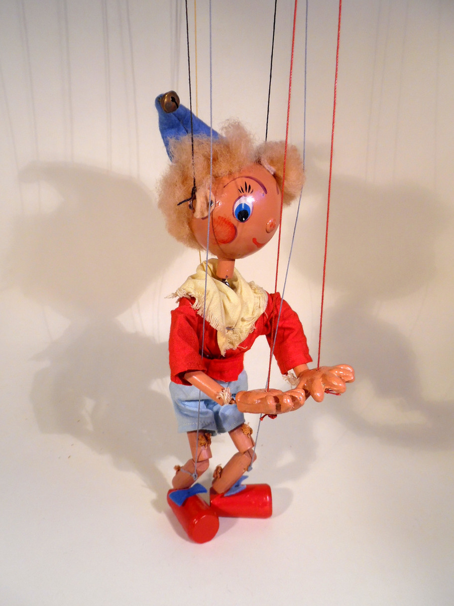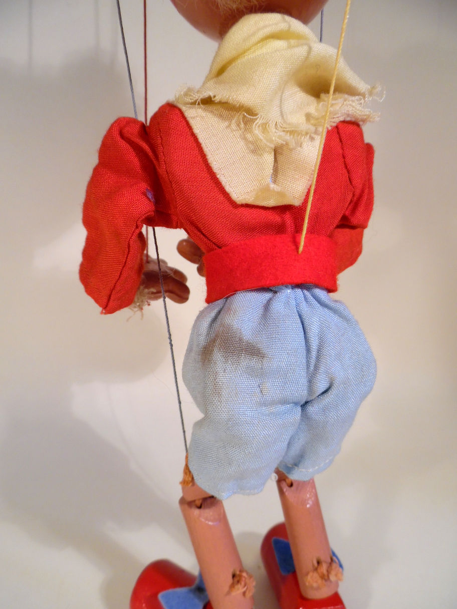 Type SS Noddy, the rarer small wood head type with blond hair. His face paint is very good. His shirt is good, his blue shorts are a little dirty on the side as seen. The yellow scarf is good with minimal fraying. He wears a felt hat with bell attached which is good. The puppet still has felt bows on his brightly painted red shoes, he also still has the felt ears, often damaged. He shows some signs of ageing but is in generally good condition. The composition hands are in good condition and he has wooden legs. The box has a previous owners drawings on the base and is shelf worn, it has the Noddy stamp one end.