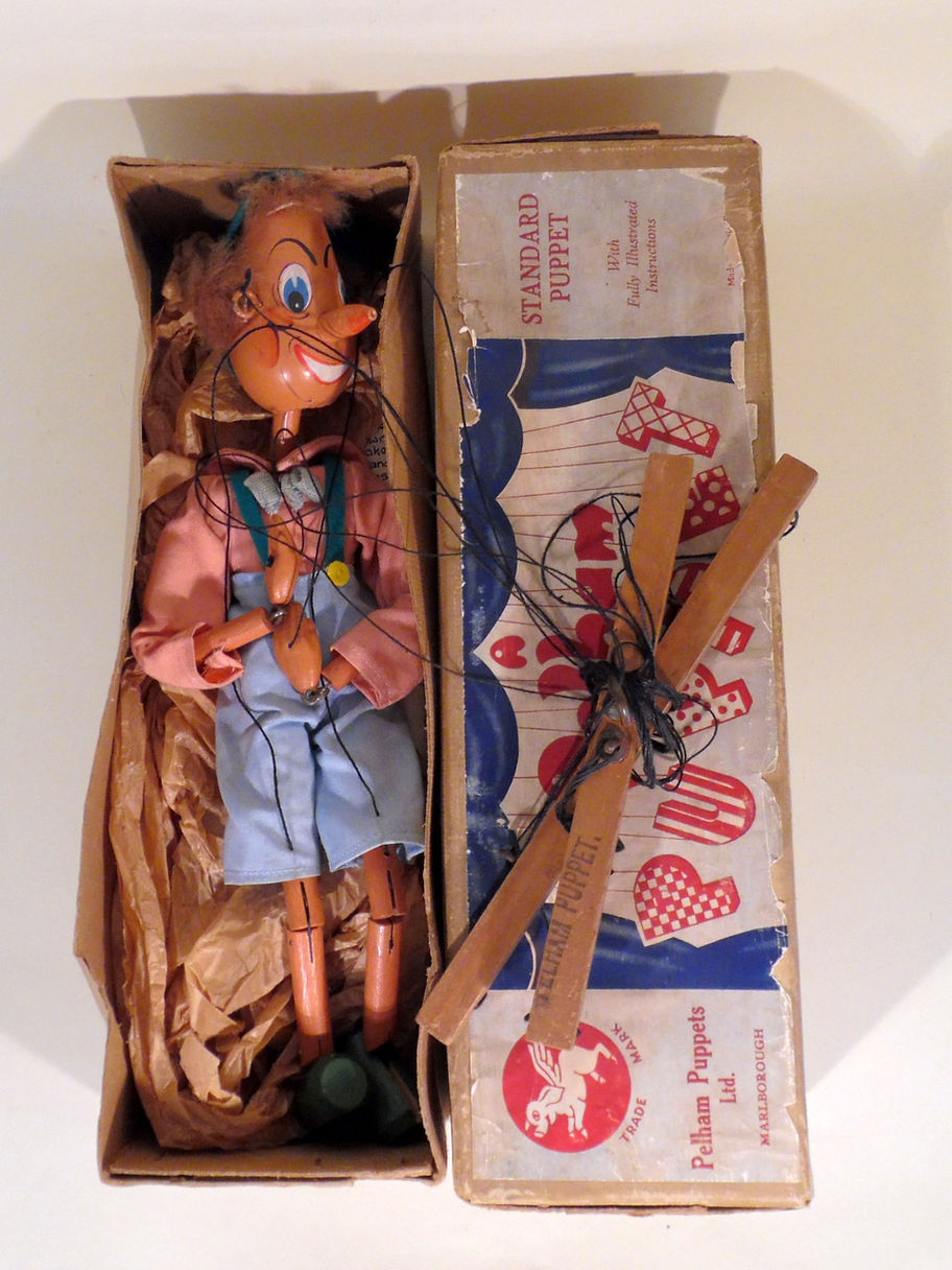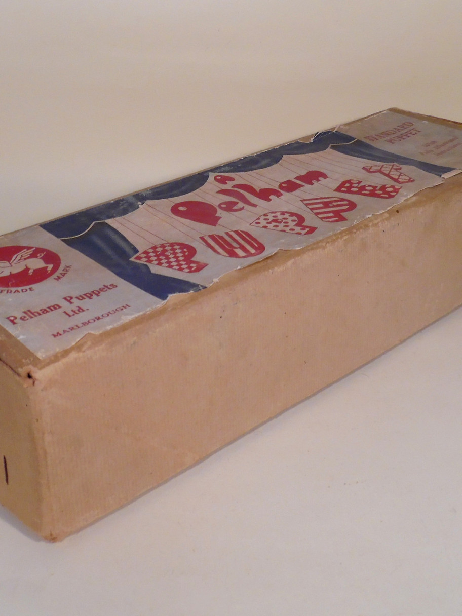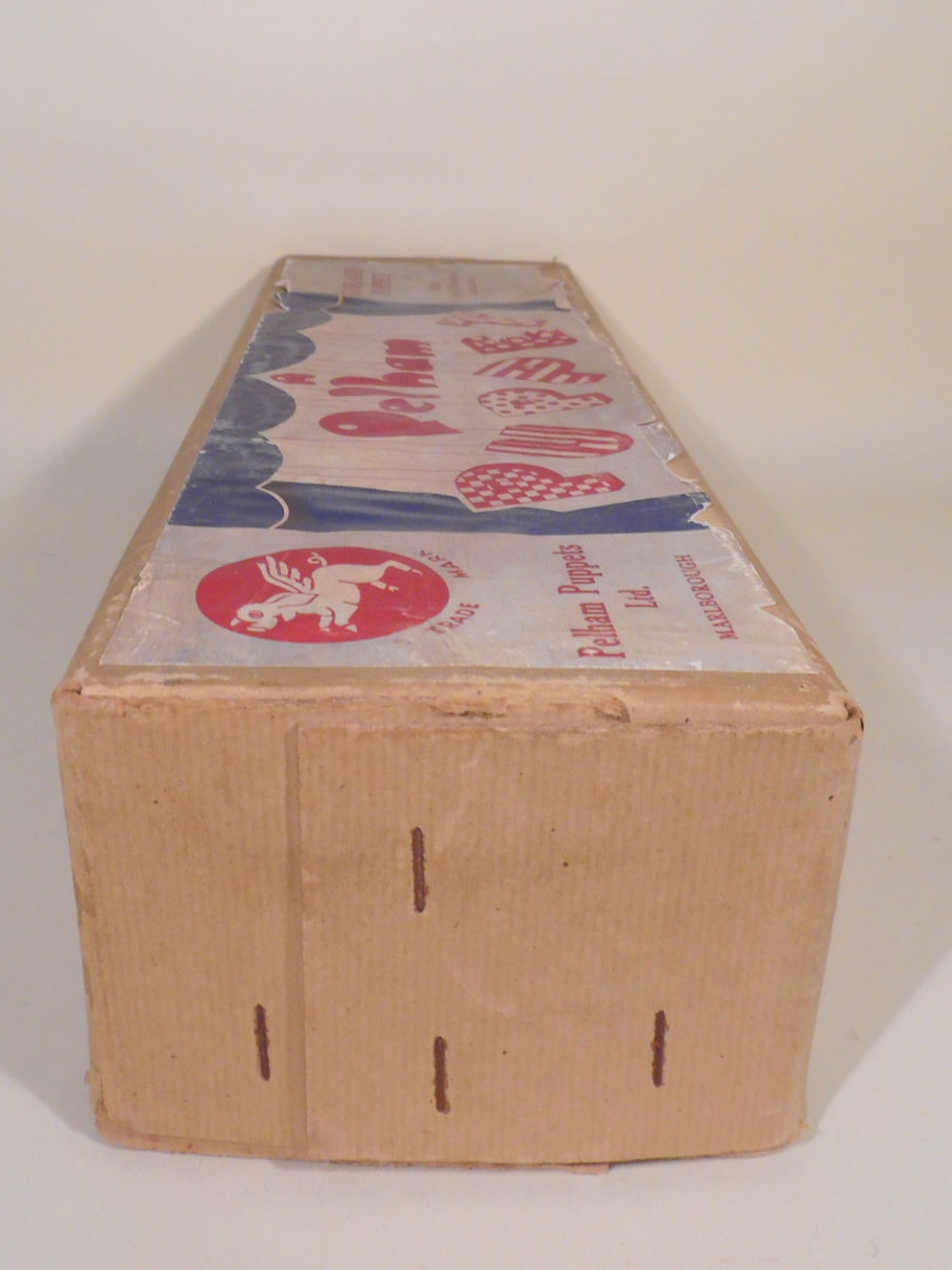 Type SS Pinocchio 1950's type. Pinocchio has a good face with oval wooden head and long pointed nose. His real fur hair is good. The costume is good with no damage to the felt buttons or braces. It is a little dusty with age. The black hand strings are very worn and he may need restringing in the future, I will leave him as he is as these have not broken but just look as if they might. The box is in good shelf worn condition with Type SS barely visble. Instructions with tape damage included. (This is the puppet that is photographed in Volume 1 Photographic Guide by Paul Coleman, the box has been changed, Page 68.)