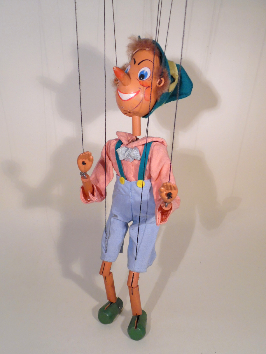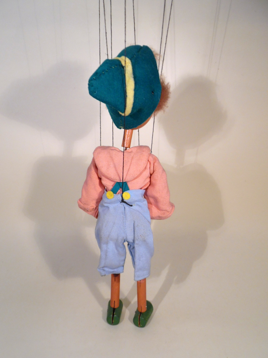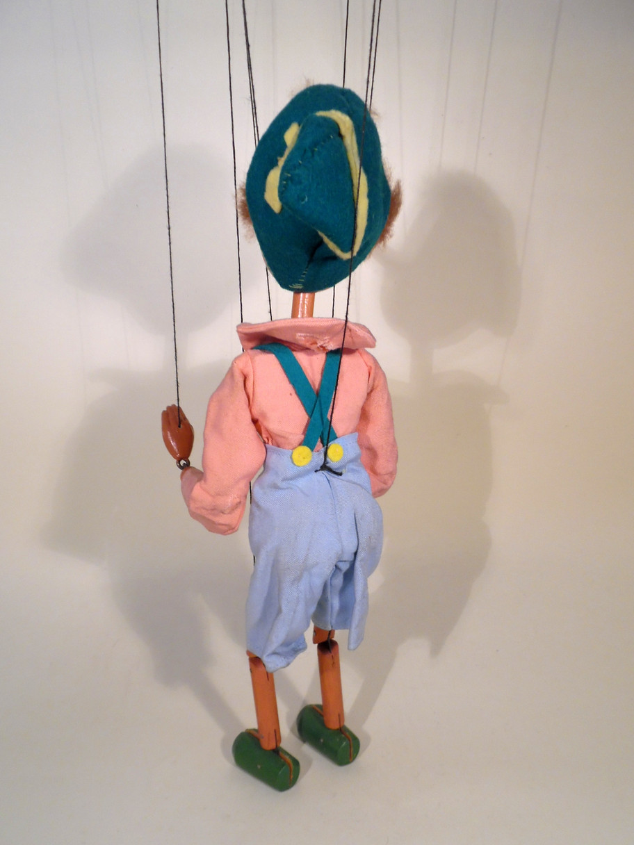 Type SS Pinocchio 1950's type. Pinocchio has a good face with oval wooden head and long pointed nose. His real fur hair is good. The costume is good with no damage to the felt buttons or braces. It is a little dusty with age. The black hand strings are very worn and he may need restringing in the future, I will leave him as he is as these have not broken but just look as if they might. The box is in good shelf worn condition with Type SS barely visble. Instructions with tape damage included. (This is the puppet that is photographed in Volume 1 Photographic Guide by Paul Coleman, the box has been changed, Page 68.)