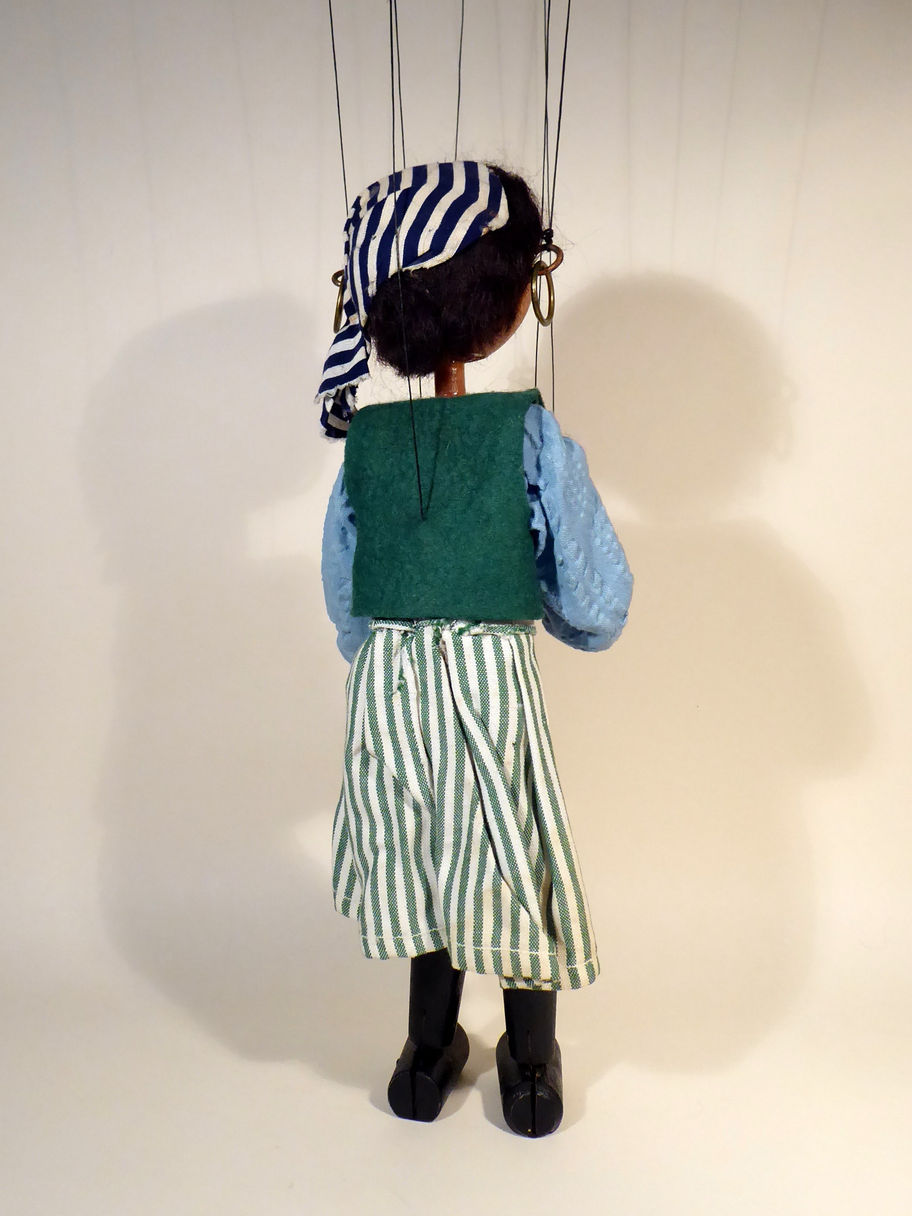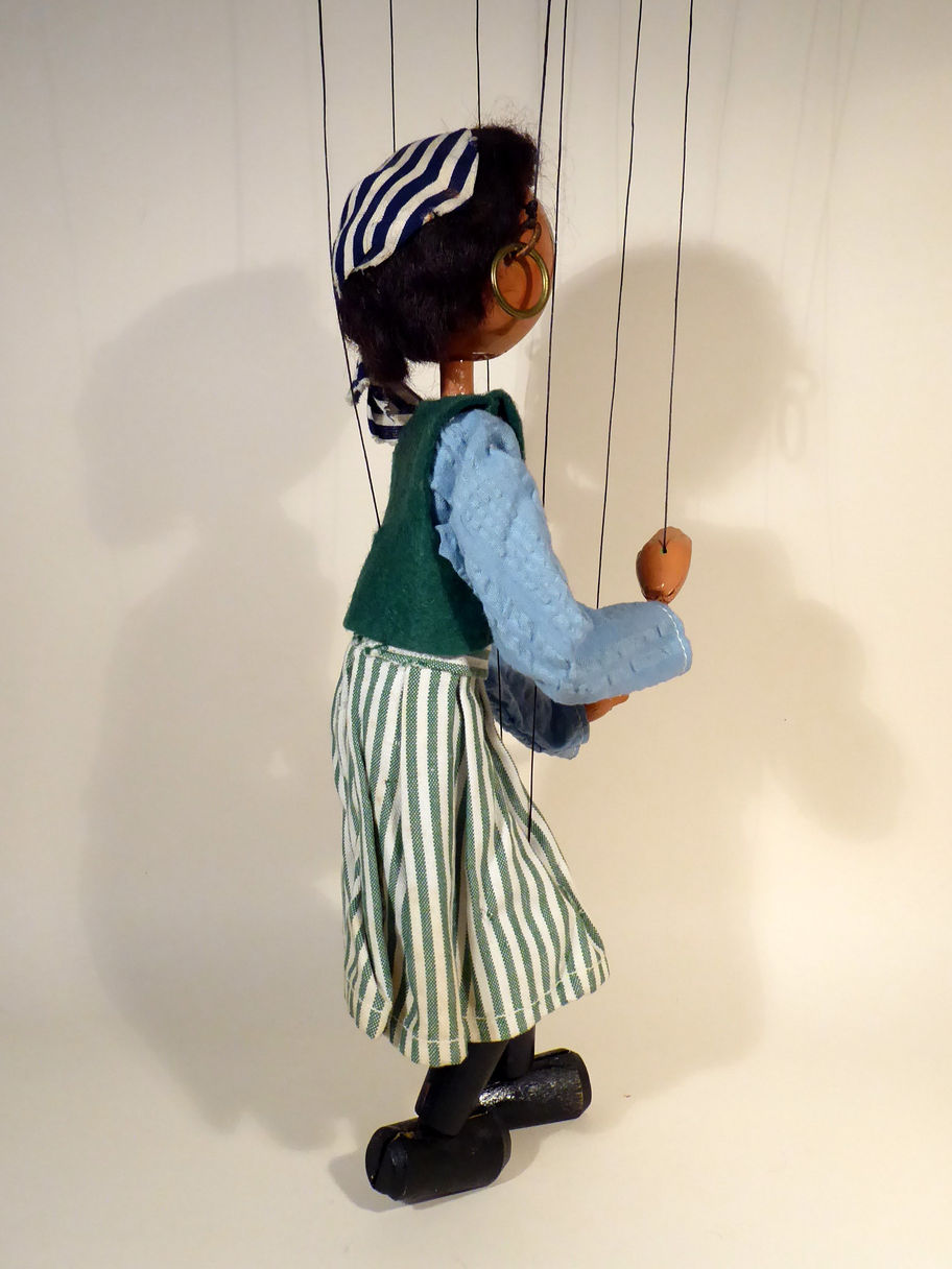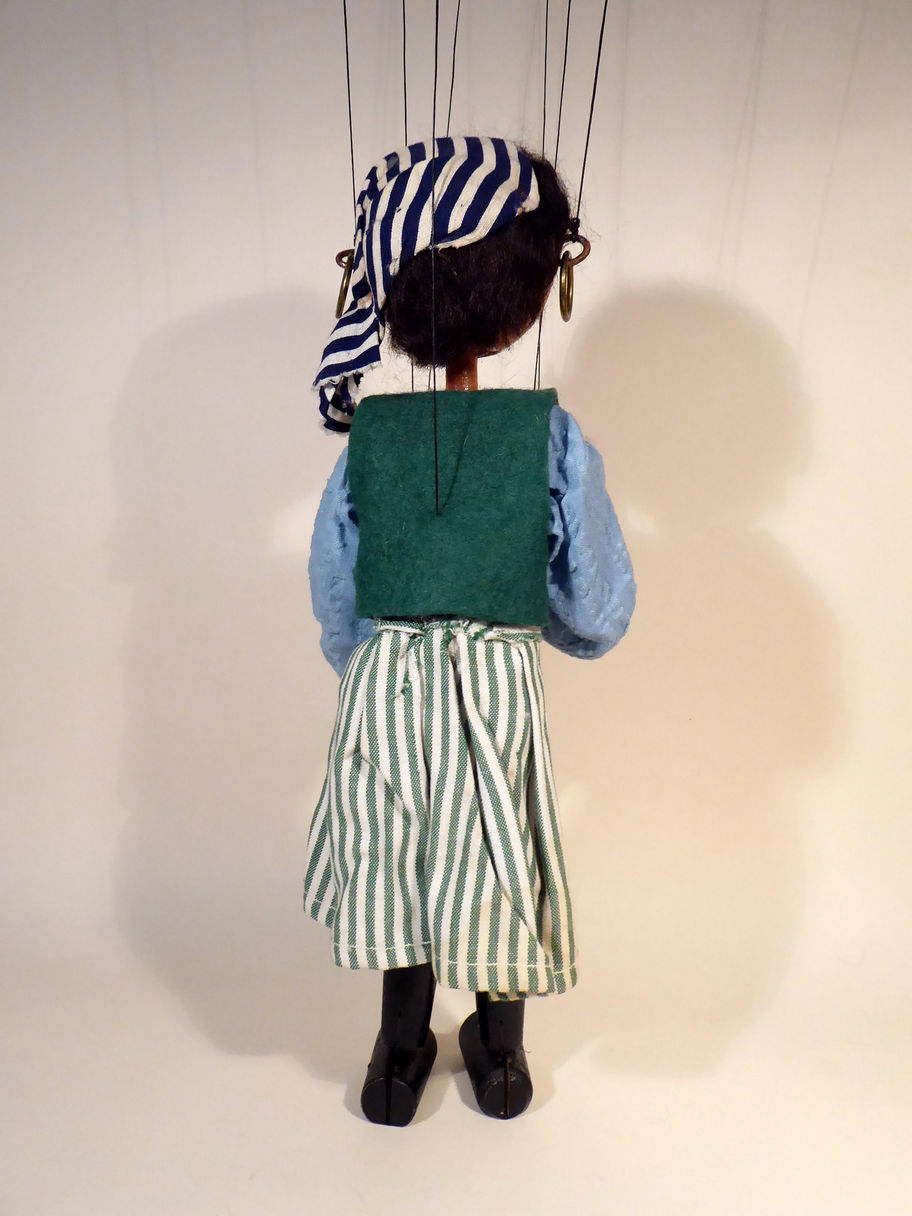 Type SS Pirate Woman, a rarely seen puppet, 1950's era. A lovely puppet with a nice colourway of clothes. She has a good seersucker material blouse with green felt waistcoat. The skirt has some wear to the fabric, which enhances the character rather than detracts in some ways. The headscarf also has some wear. She has hooped rings in her ears. The black hair is crepe type rather than fur. The face paint is good with some pin prick paint losses on the metal nose. She has the wooden toggle type boots,black painted and the style used only for the Russian,Pirate and early Gypsy puppets. Box is stamped for the Pirate Man and is in good used condition.