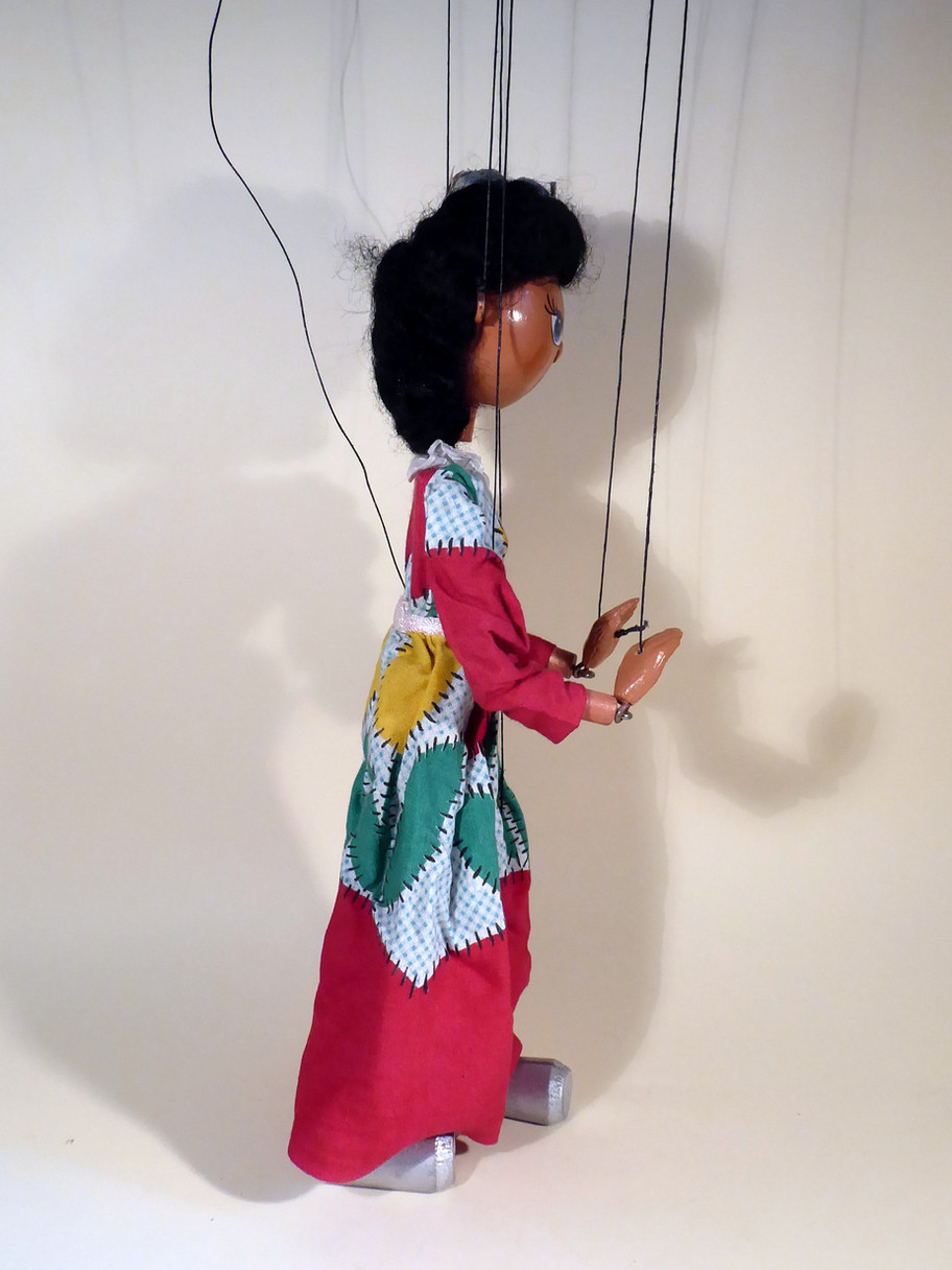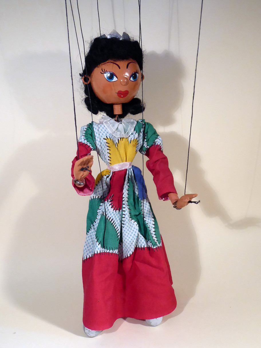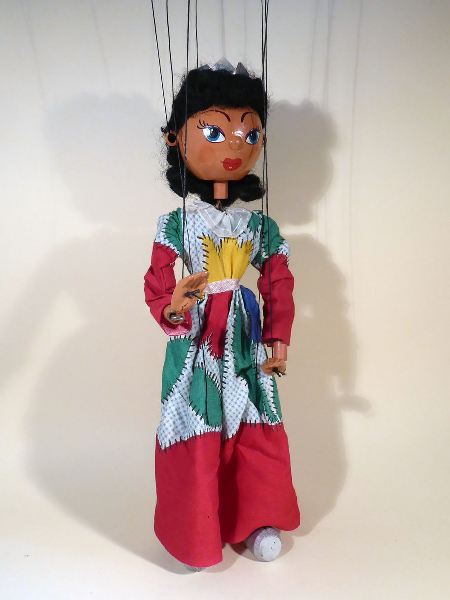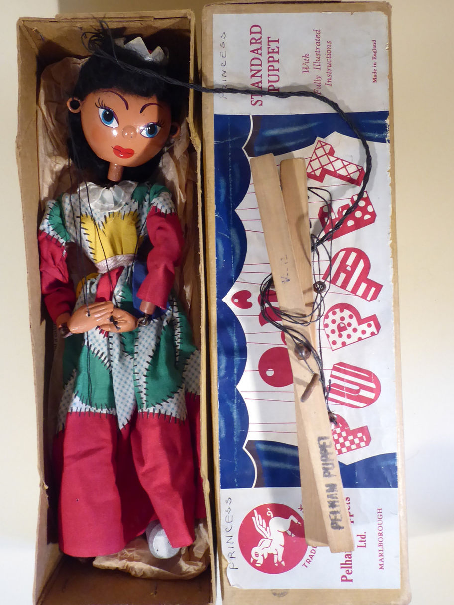 Type SS Queen 1950's era. She is in good used condition. She has her cardboard crown on her head. The face paint is very good. She wears a gown which has a tiny pin prick hole at the lower left front, but otherwise is good. She wears silver painted toggle shoes. Box is stamped correctly and would be for this era puppet. Letter to join the club is included.