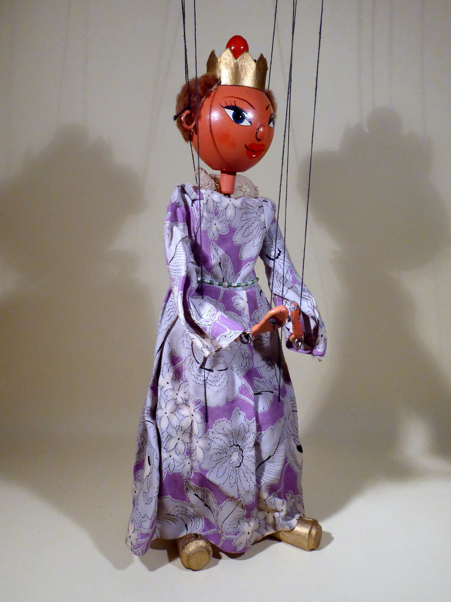 Type SS Queen. She is in good condition with card crown and little wooden ball decoration on top, only on the first versions of the SS Queen. She has real fur hair and a very good painted face. There is a slight line in the wood through the pin nose. The small lead hands have very little paint loss. The dress has a patterned material underskirt. Bothe the dress and skirt are in lovely condition, just a small hole at the hem of the gown, see image. The belt is made from the usual tiny beads.When I first sold one like this I thought the beads had been added possibly, but now I have sold several with the same type of pretty belt. The legs are painted white with gold for the lower part and shoes. Box is correct era/style but a previous owner has written Policeman at both ends and on base.