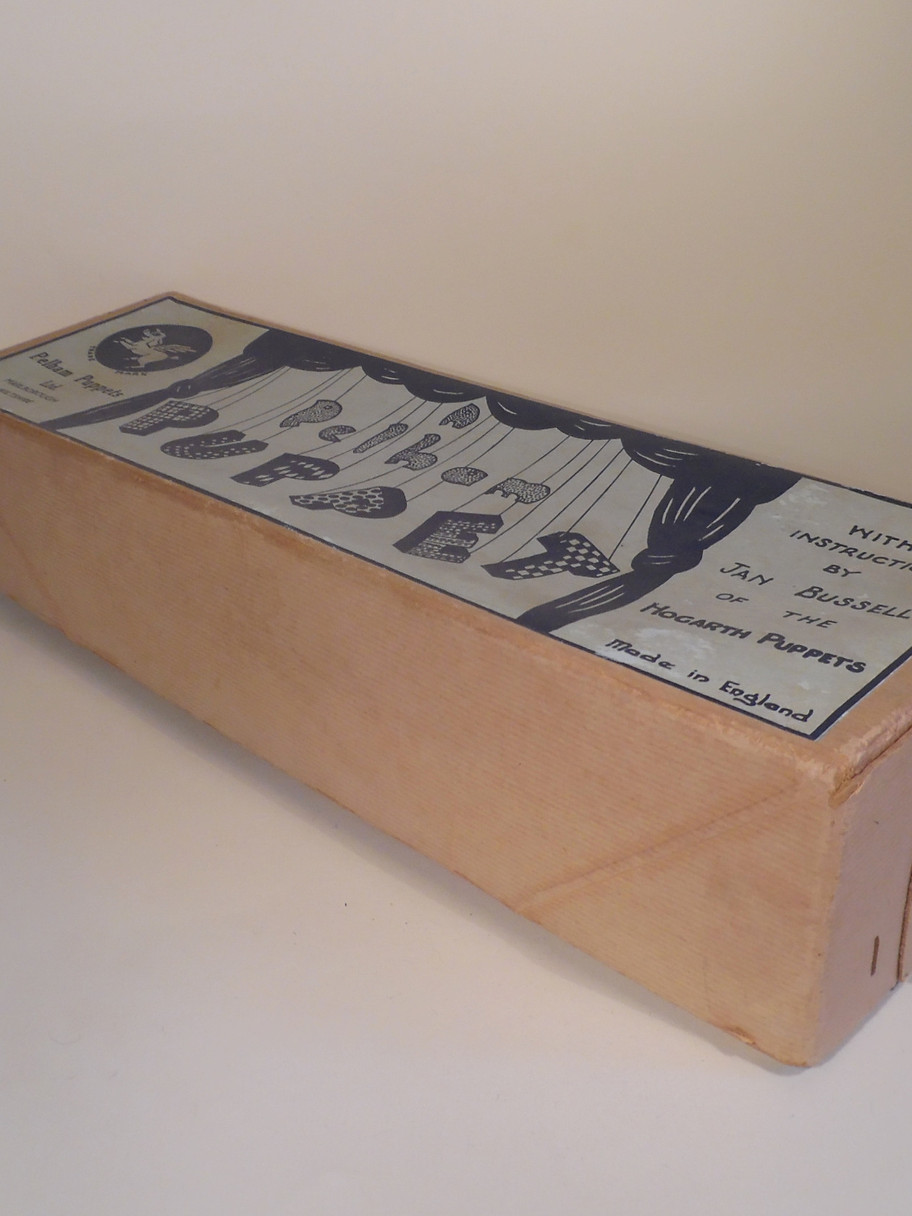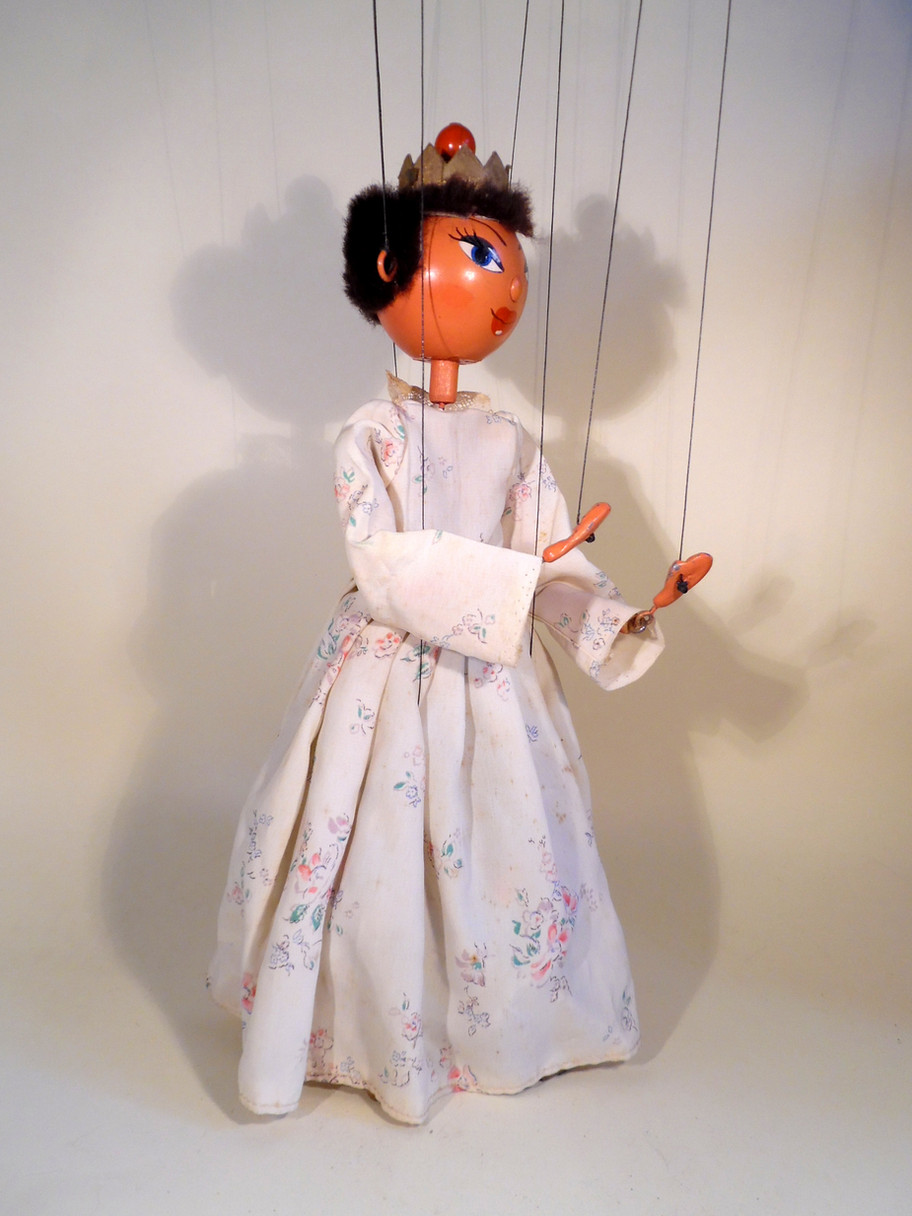 Type SS Queen. She is in good condition with card crown and little wooden ball decoration on top, only on the first versions of the SS Queen. She has real fur hair and a very good painted face. The small lead hands have little paint loss. The dress has a patterned material underskirt. The belt is made from tiny beads, this is often seen on this puppet and is not an addition. The light cotton material has some ageing marks barely noticeable on display. The legs are painted white with gold for the lower part and shoes. Box is excellent and stamped SS Queen.