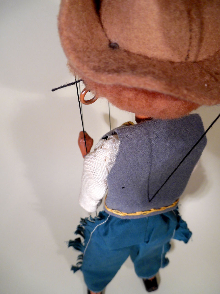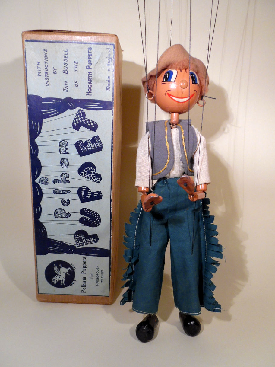 Type SS Wonky era Cowboy. He has a sweet face. His clothes are good with some minor defects. The shirt has some wear on the shoulders and the felt waistcoat has some wear with also moth holes as shown in the photos. The cotton 'chaps' trousers are good. He has a good felt hat with real brown fur hair under. The puppet is from the wonky era and has toggle parts for upper limbs rather than the usual wooden parts for upper and lower legs. He has small lead hands and Wonky thick upper arms. The box is not his original box, it is stamped SS Sailor and has handwritten Witch over.