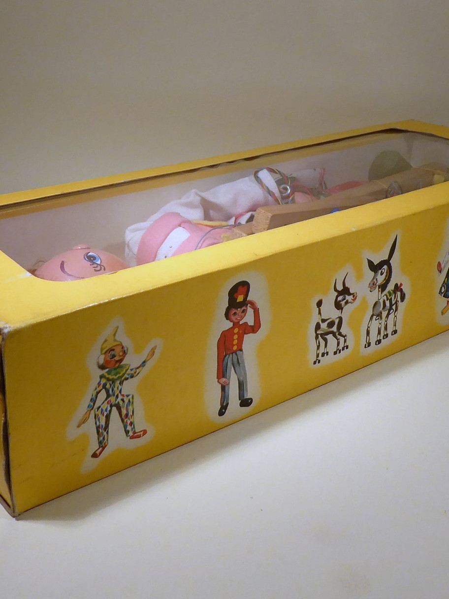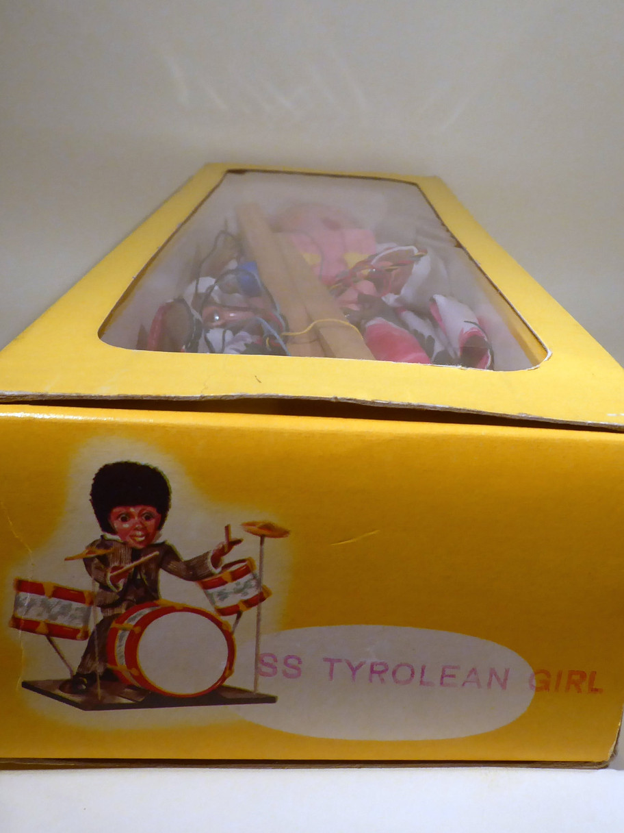 Type SS Tyrolean Girl 1960's. She has wooden legs and small composition hands. This one has pretty auburn hair. Clothes are good apart from the white blouse with some moth damage as shown in images. Felt braces and felt hat with flowers are good. Face paint is good. Box is the first style cellophane sleeve type and is stamped at the end of the box correctly.