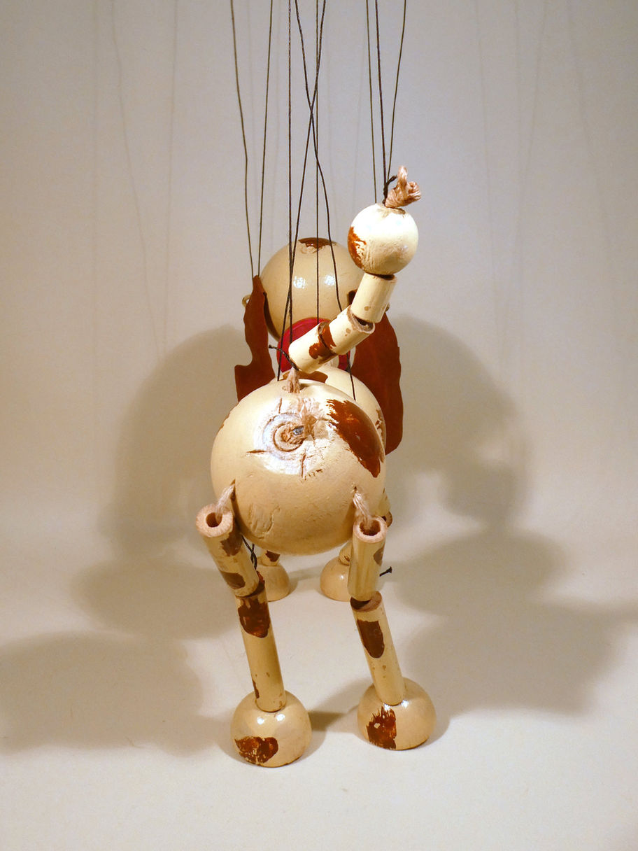 He is made from wooden balls and bamboo limbs.