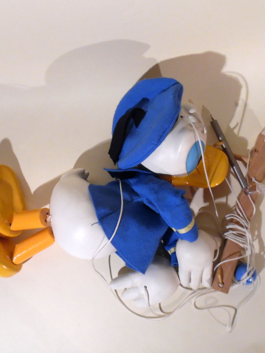 Display Range Donald Duck 1980's. Excellent clean fresh condition, stored well. Clothes are as new. A difficult puppet to photograph as he weighs heavy at approx 1.5 kg and is tall 16" approx. I have not seen these puppets in the flesh before and I think one hand may have been repaired at it's base where it pushes into the screw eye as photo shows.